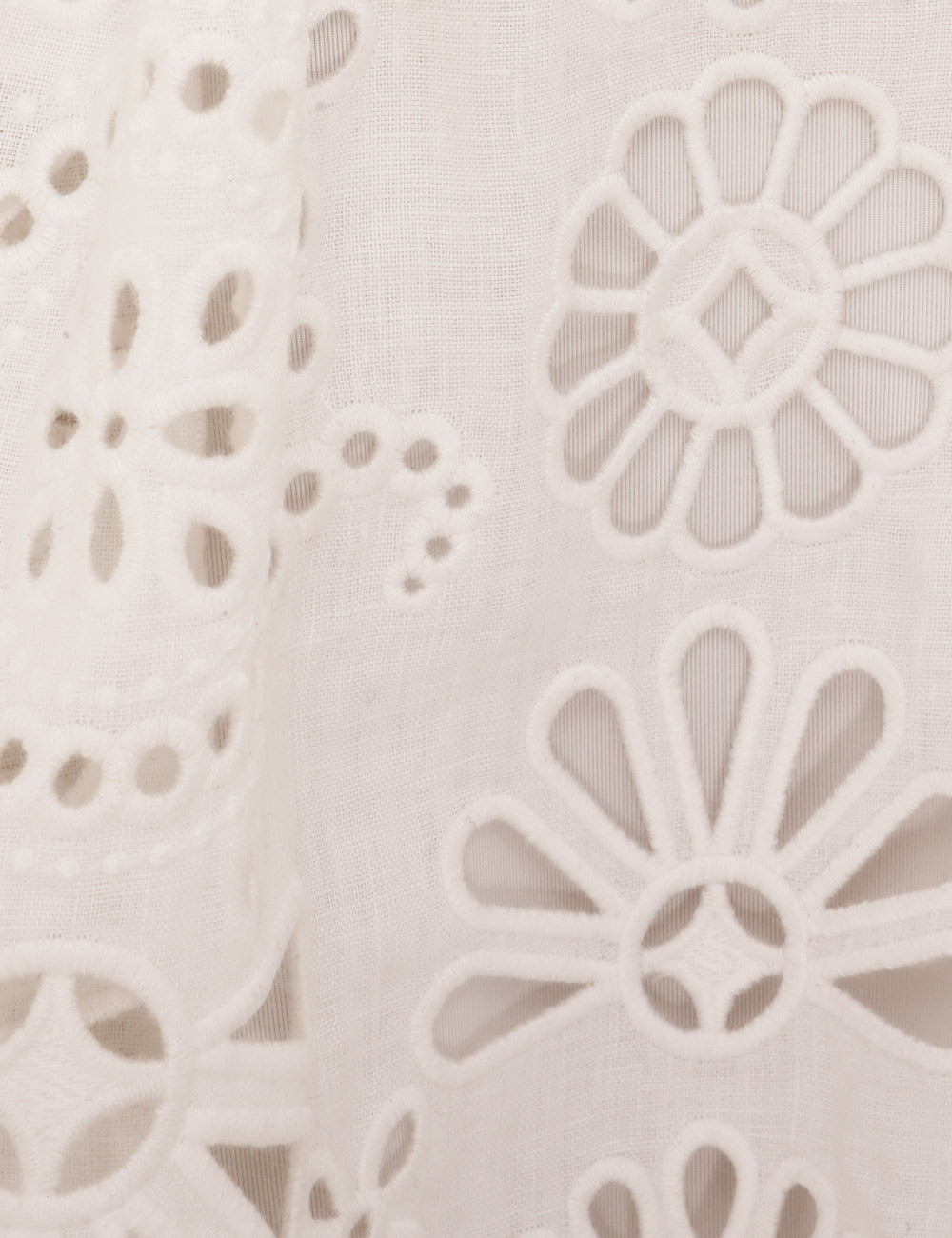 The Acacia Broderie Mini Dress in Ivory from our Resort Swim 2025 Collection. A linen mini dress featuring buttons down the top front placket and embroidered detailing throughout; finished with a scalloped hem on the skirt.
