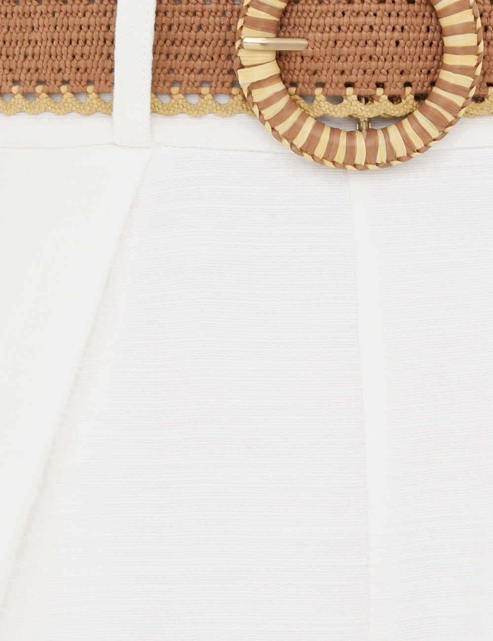 The Acacia Tuck Short in Ivory from our Resort Swim 2025 Collection. A high waisted linen short featuring side seam pockets and a raffia trim belt.