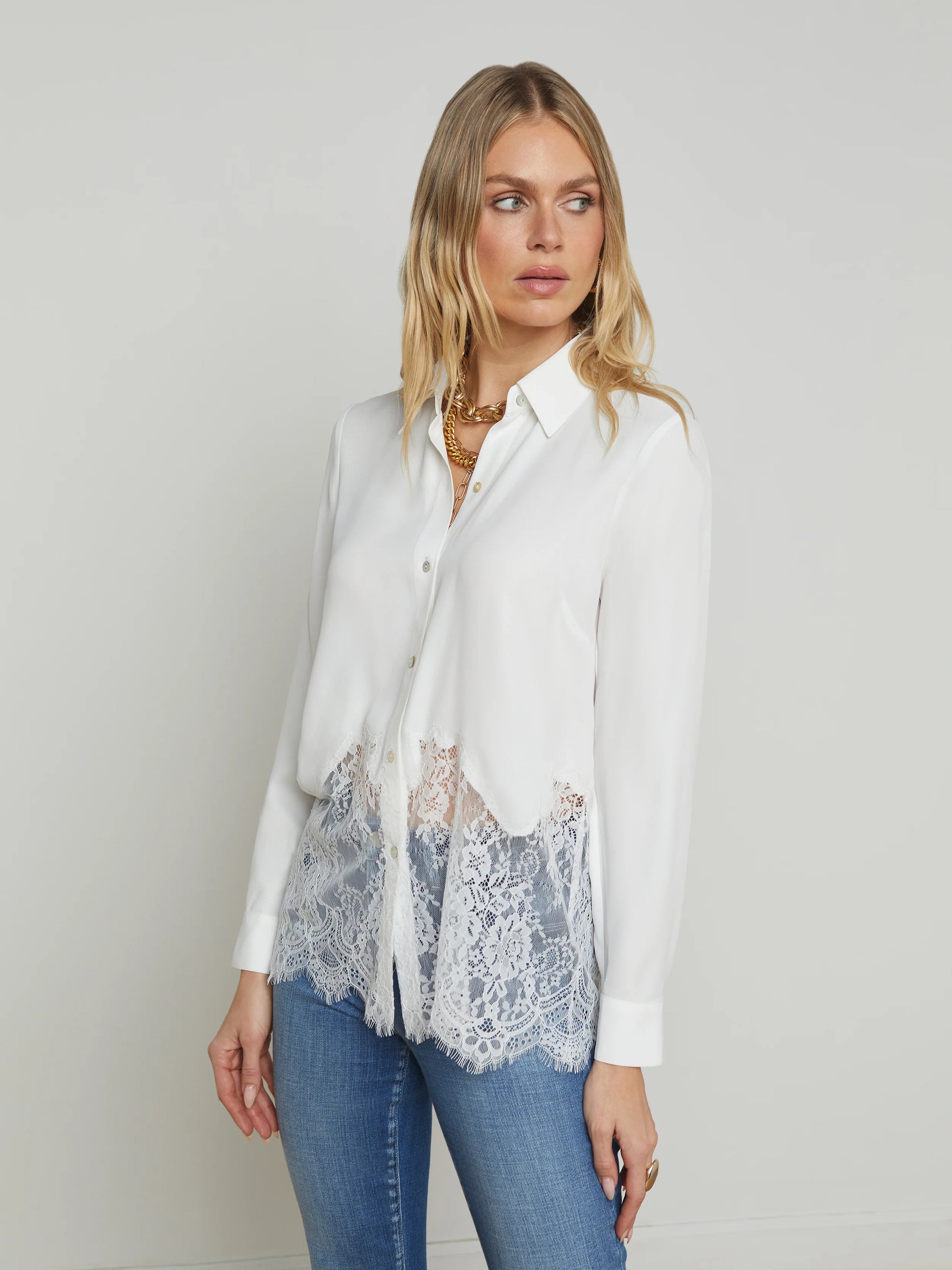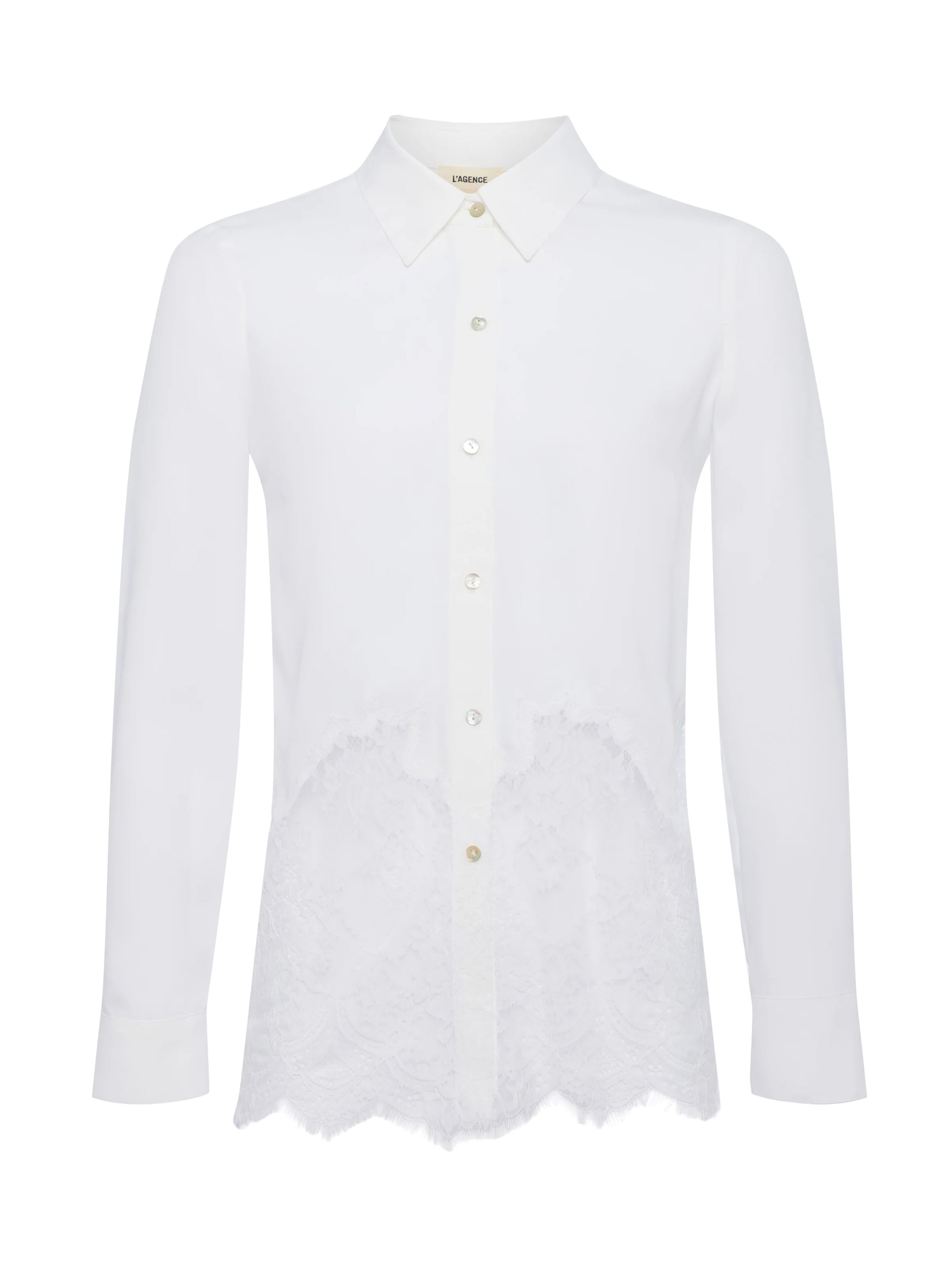 A classic shirt gets the L’AGENCE treatment with stunning sheer lace. Now in white.
