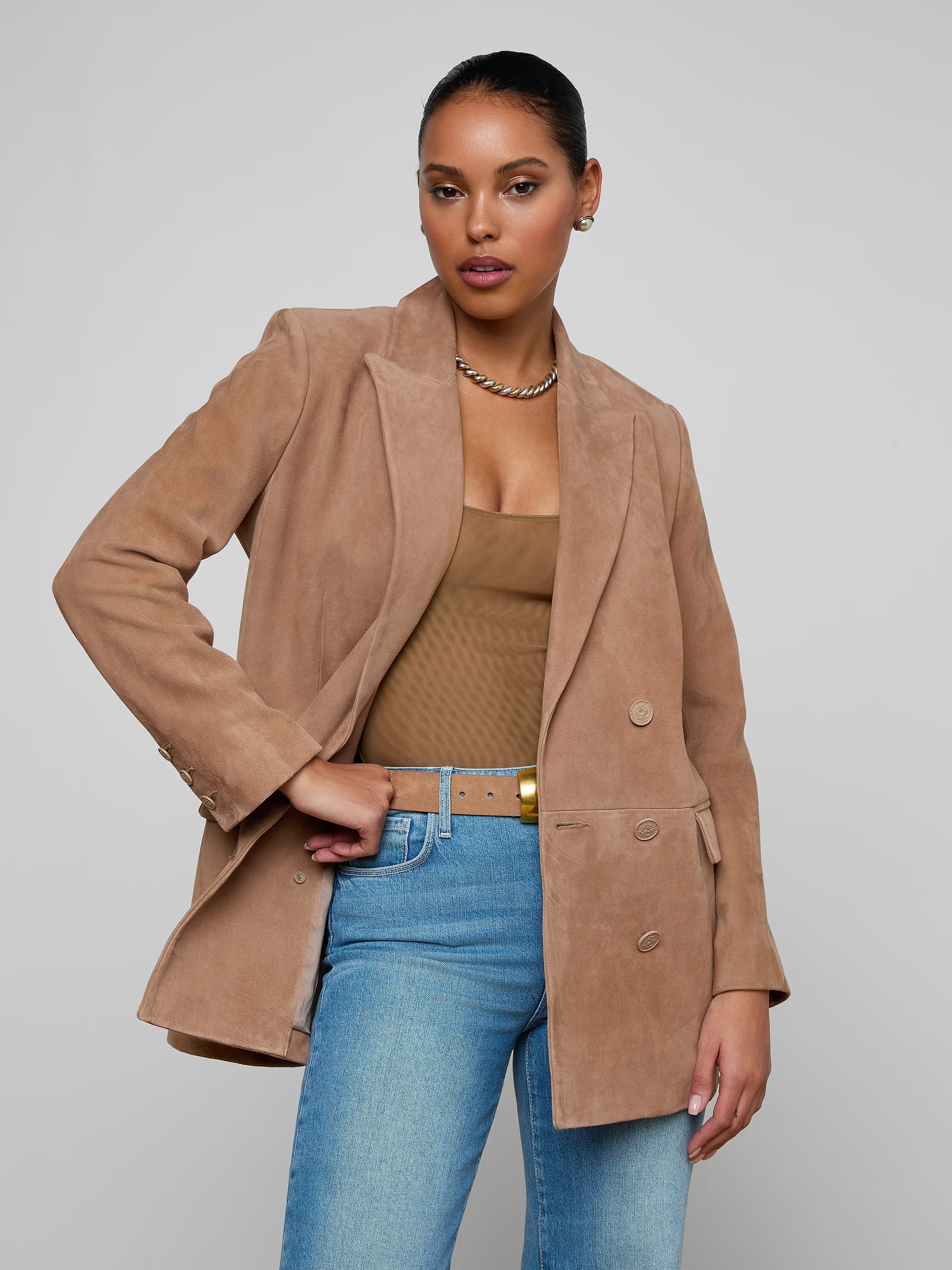 Crafted from a supple, mid-weight suede, the Aimee boyfriend blazer features a cool-without-trying oversized fit and timeless appeal. Now in light brown.