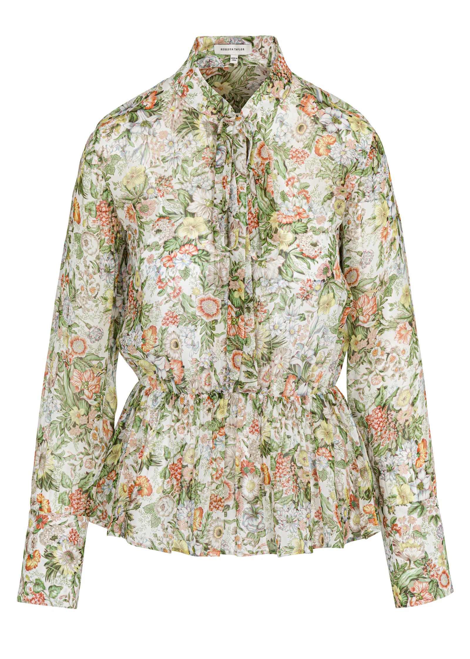 Featuring a delicate all-over floral print and a charming tie front, this blouse offers a feminine touch to any outfit. The lightweight chiffon fabric and peplum hem add an airy elegance, perfect for both casual and dressy occasions.