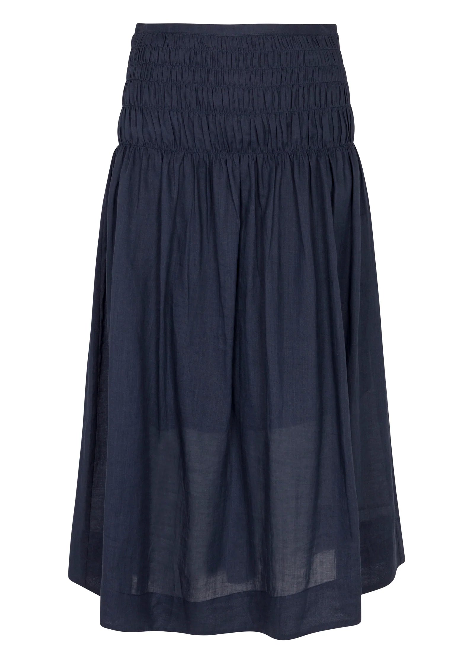 Designed with fixed smocking detail for a flattering silhouette, this navy skirt flows gracefully into a soft, midi-length hemline. A cotton lining adds comfort and coverage, while the lightweight ramie fabric ensures breathability.