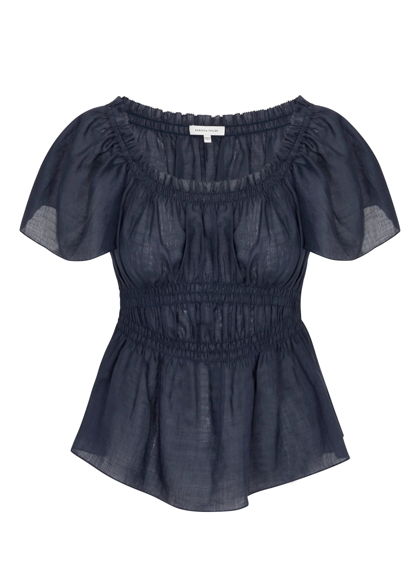 Featuring delicate picot edge detailing and elastic smocking for a flattering fit, this short-sleeve navy top exudes effortless sophistication. Crafted from breathable 100% ramie fabric, its lightweight structure makes it perfect for both casual outings and elevated occasions.
