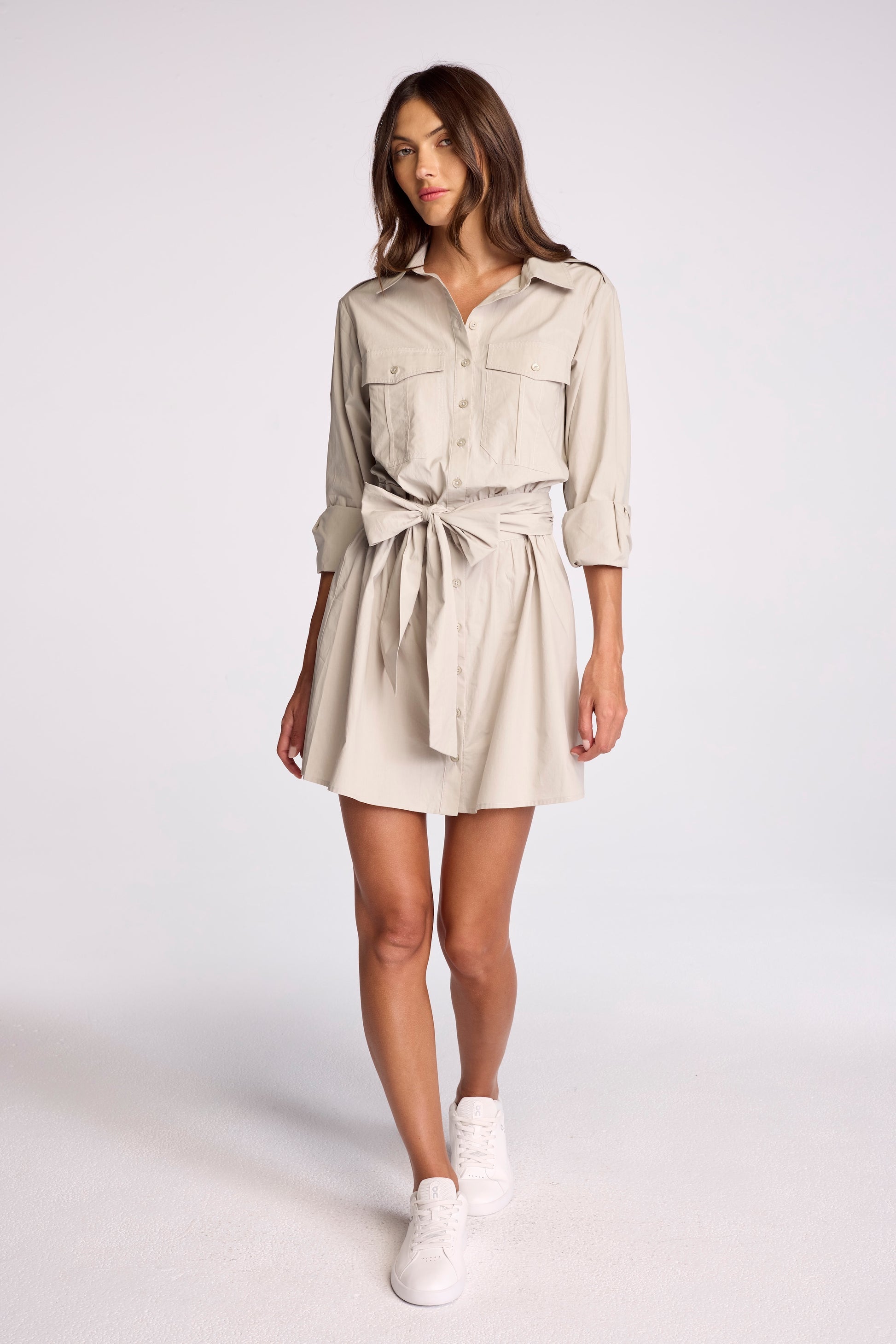 A not-so-classic shirt dress. Asterin is made from our silk finish 100% cotton poplin and features a classic button-up fit, but has a feminine edge with the cinched waist and flounced skirt.