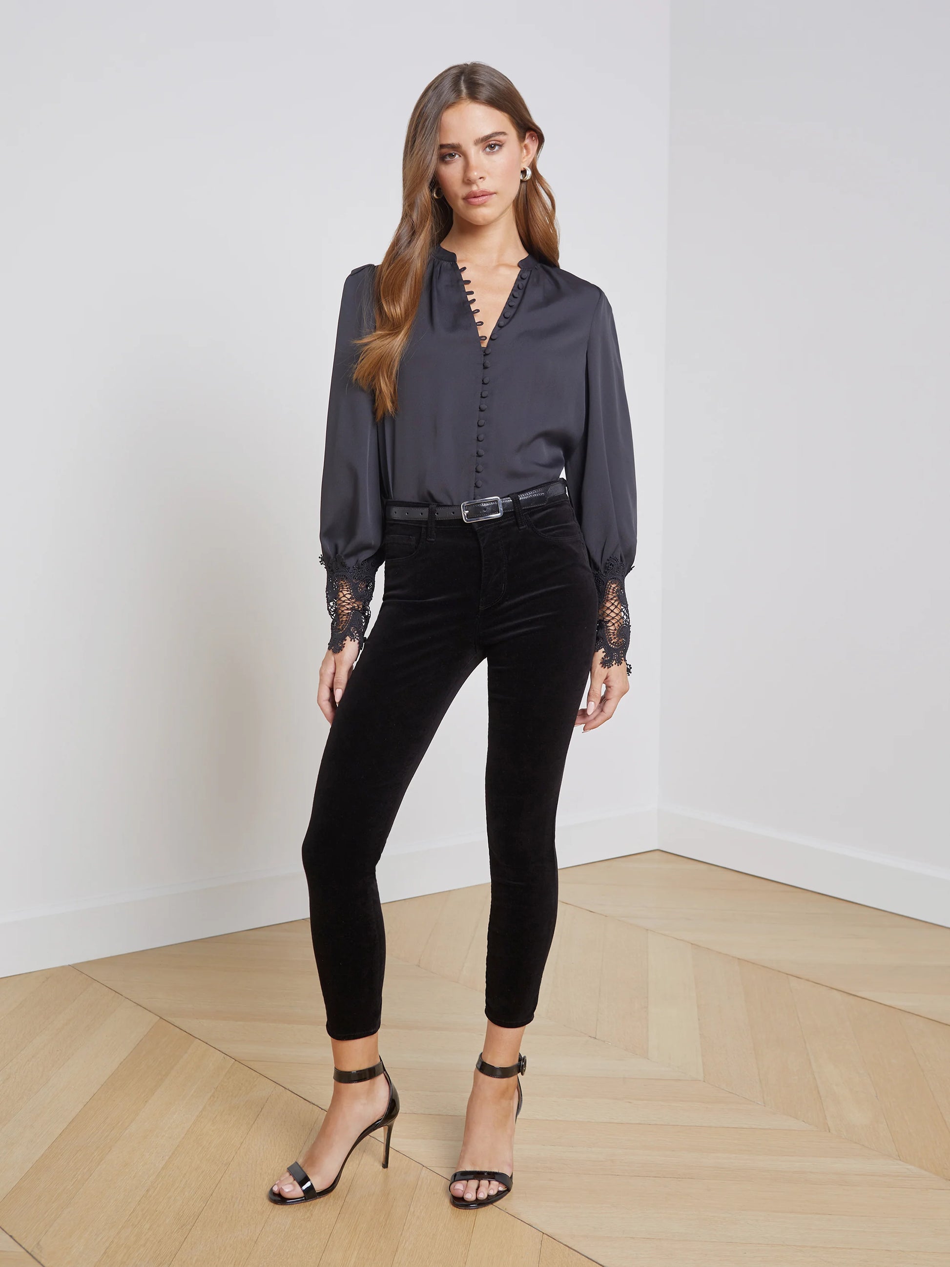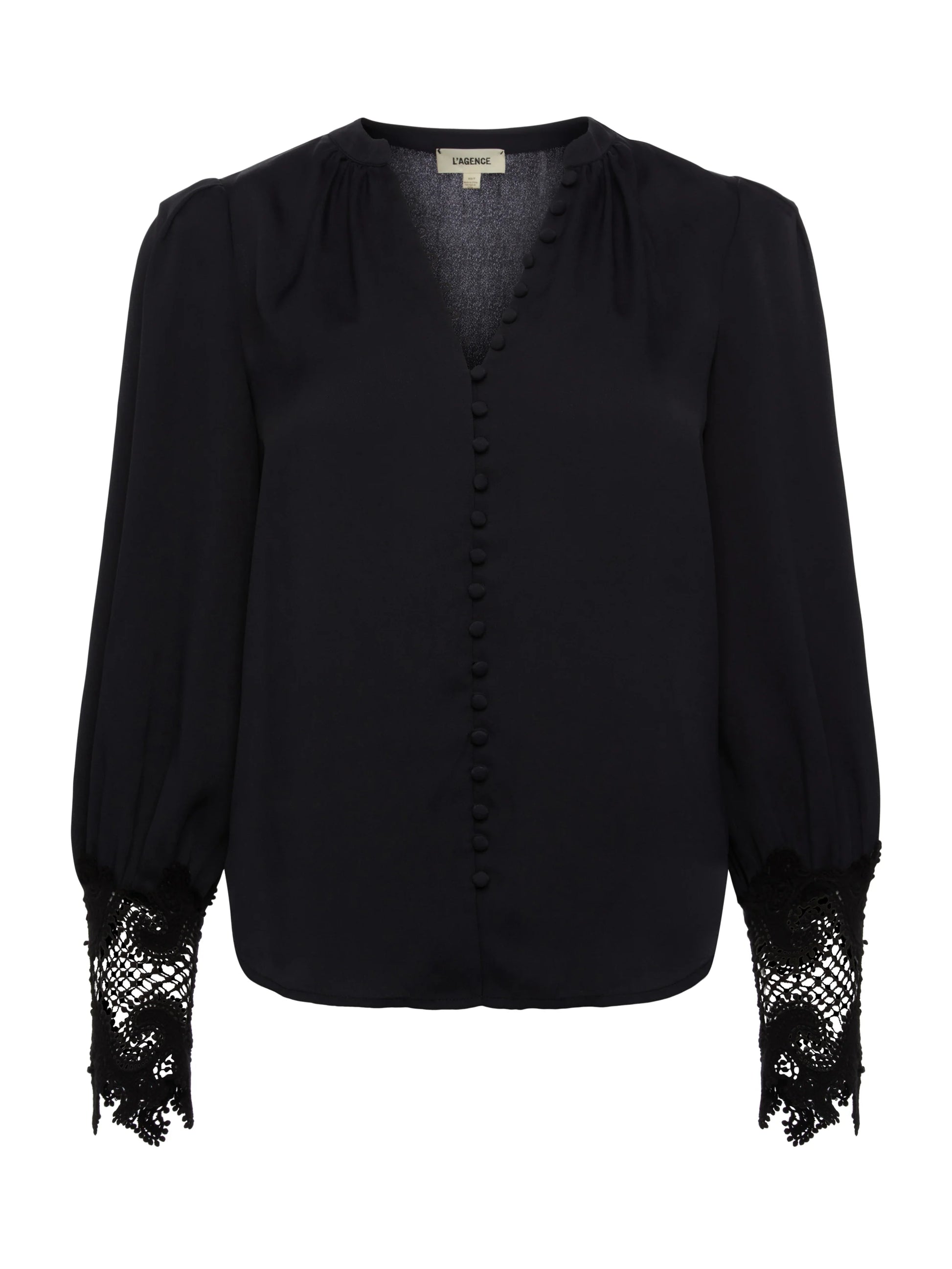 A sublimely chic blouse in pure black. Features vintage-inspired self-button-loop closure and extended cuffs are done in exquisite scalloped guipure lace. Relaxed high-low silhouette gathered into band collar. Long sleeves with pleated caps. Front button closure.