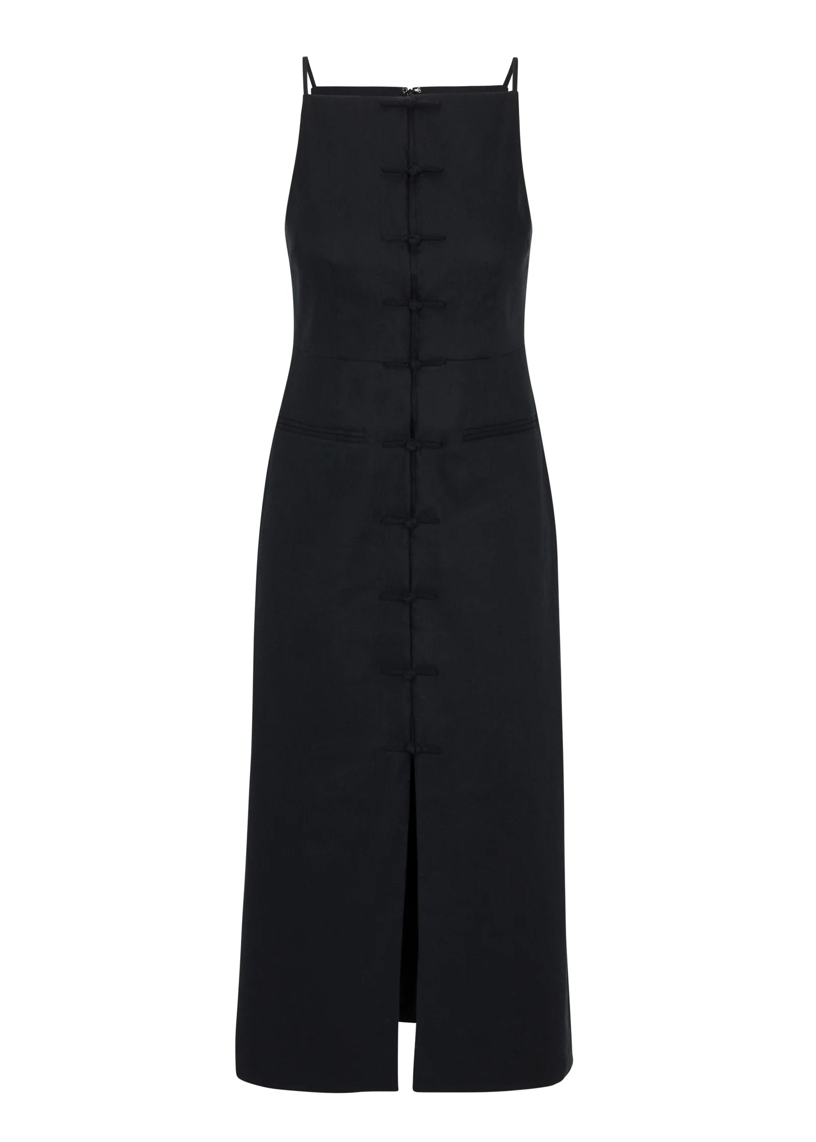 This midi-length design features a handmade frog front closure that adds a refined, handcrafted detail to its sleek silhouette. Crafted from a breathable linen blend with a touch of stretch, this dress offers both comfort and structure. Its timeless black hue and flattering fit make it a versatile choice for day-to-night dressing, perfect for a variety of occasions.