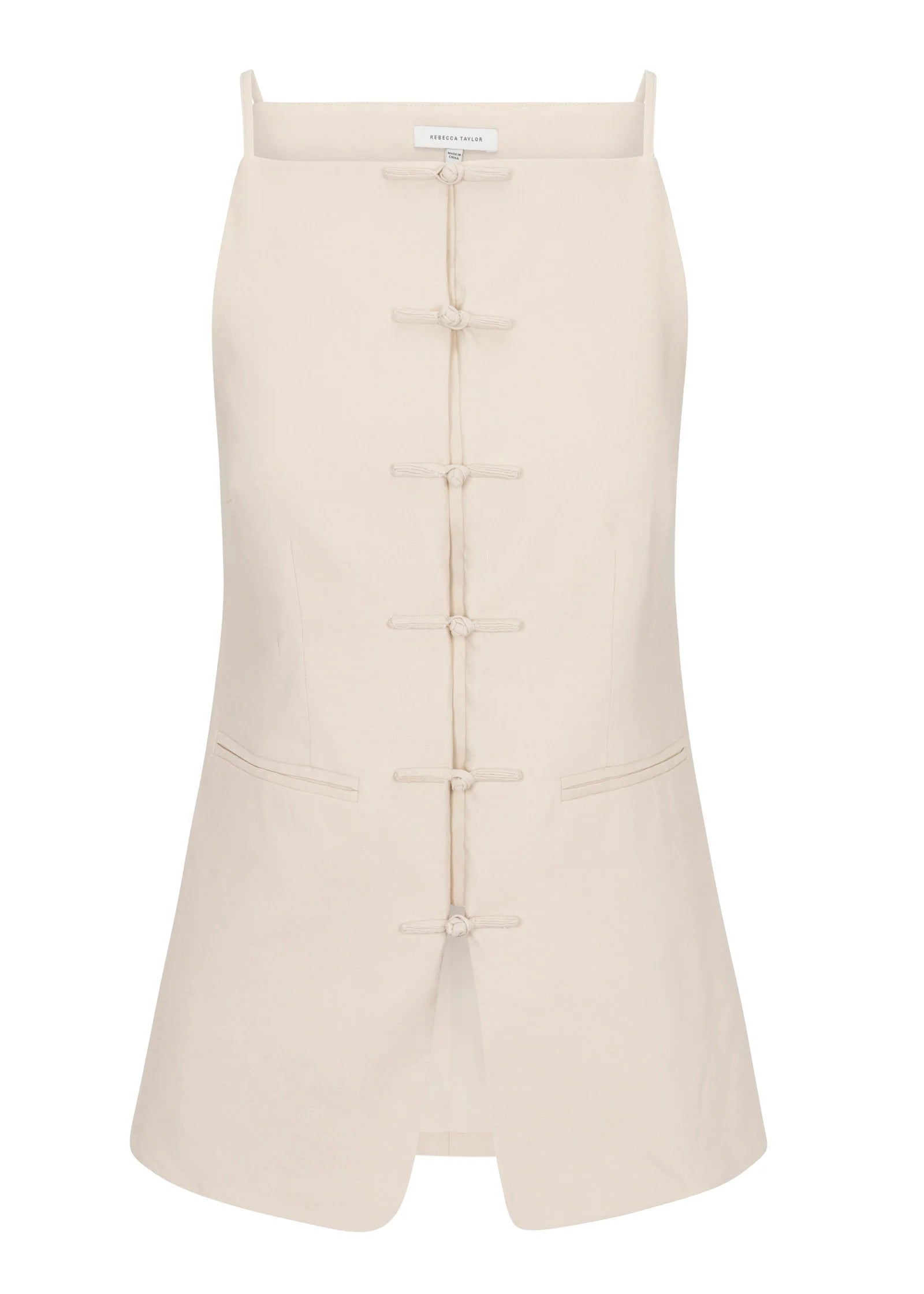 This sleeveless top is elevated by its handmade frog front closure, lending a touch of artisanal craftsmanship. Crafted from a breathable linen blend with a hint of stretch, it ensures both comfort and style. Its timeless neutral hue makes it a versatile staple, perfect for pairing with tailored trousers or flowing skirts for effortless sophistication.