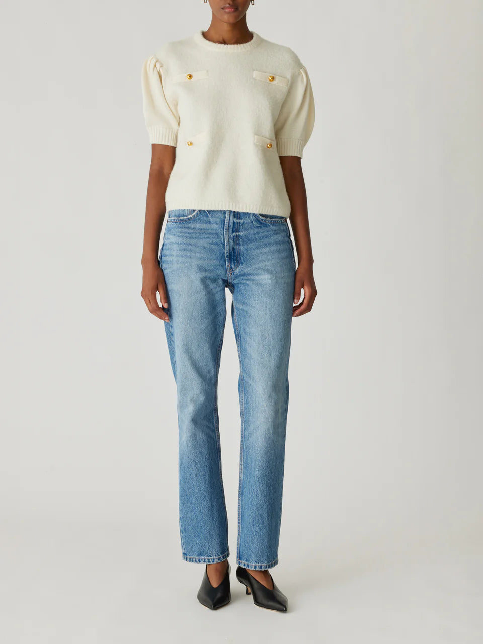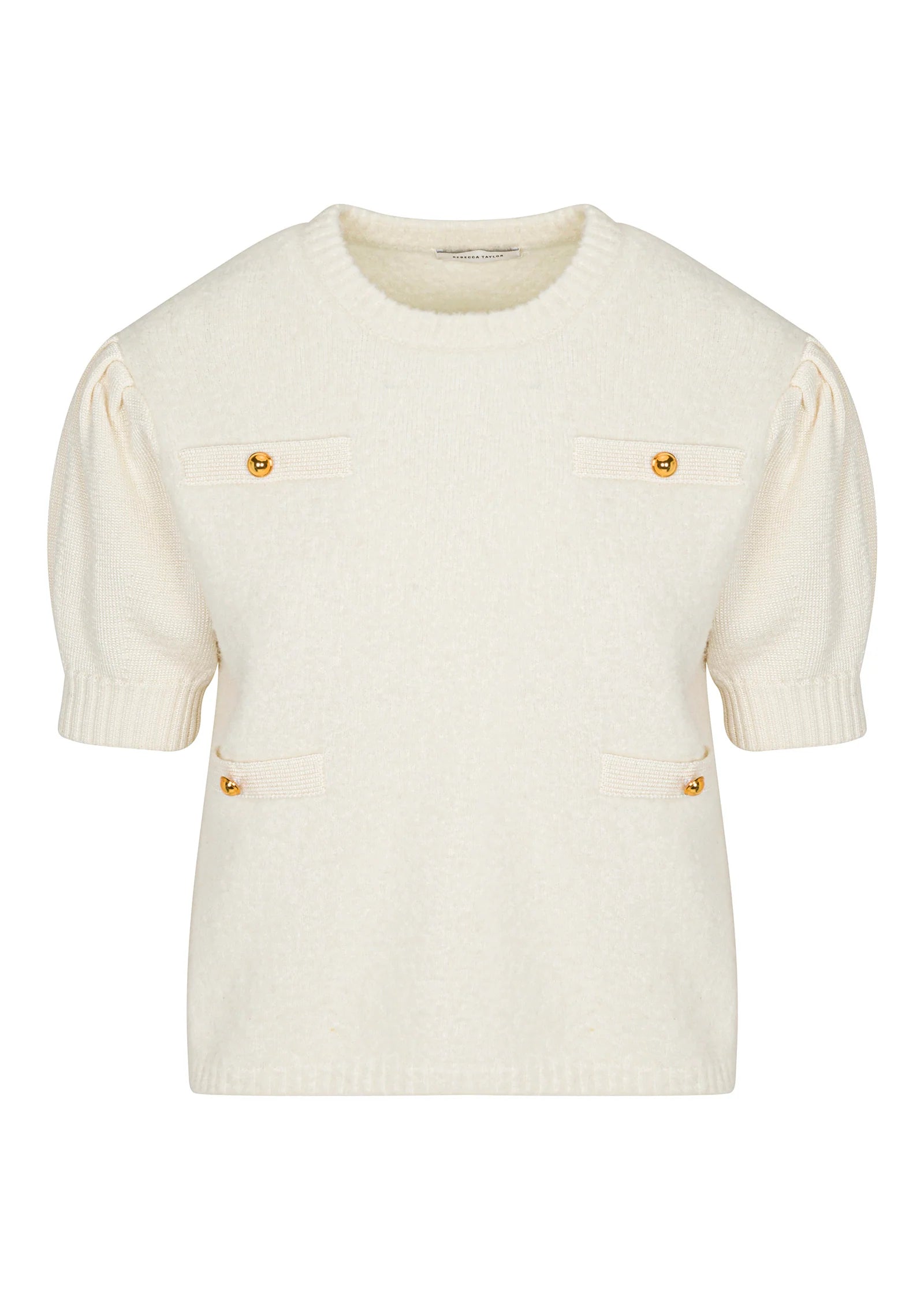 This refined piece features puffed short sleeves, and chic button details on the front pockets. Its fuzzy fabric on the body and techy sleeves makes it perfect for both work and casual outings.