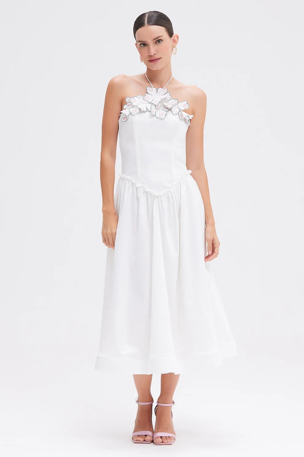 Elegant and romantic, this midi dress features sculpted floral appliqués at the neckline with delicate straps that connect at the front and wrap around the neck, creating a halter-style silhouette. The structured bodice and softly flared skirt offer a flattering, feminine shape—perfect for special occasions or modern bridal moments.