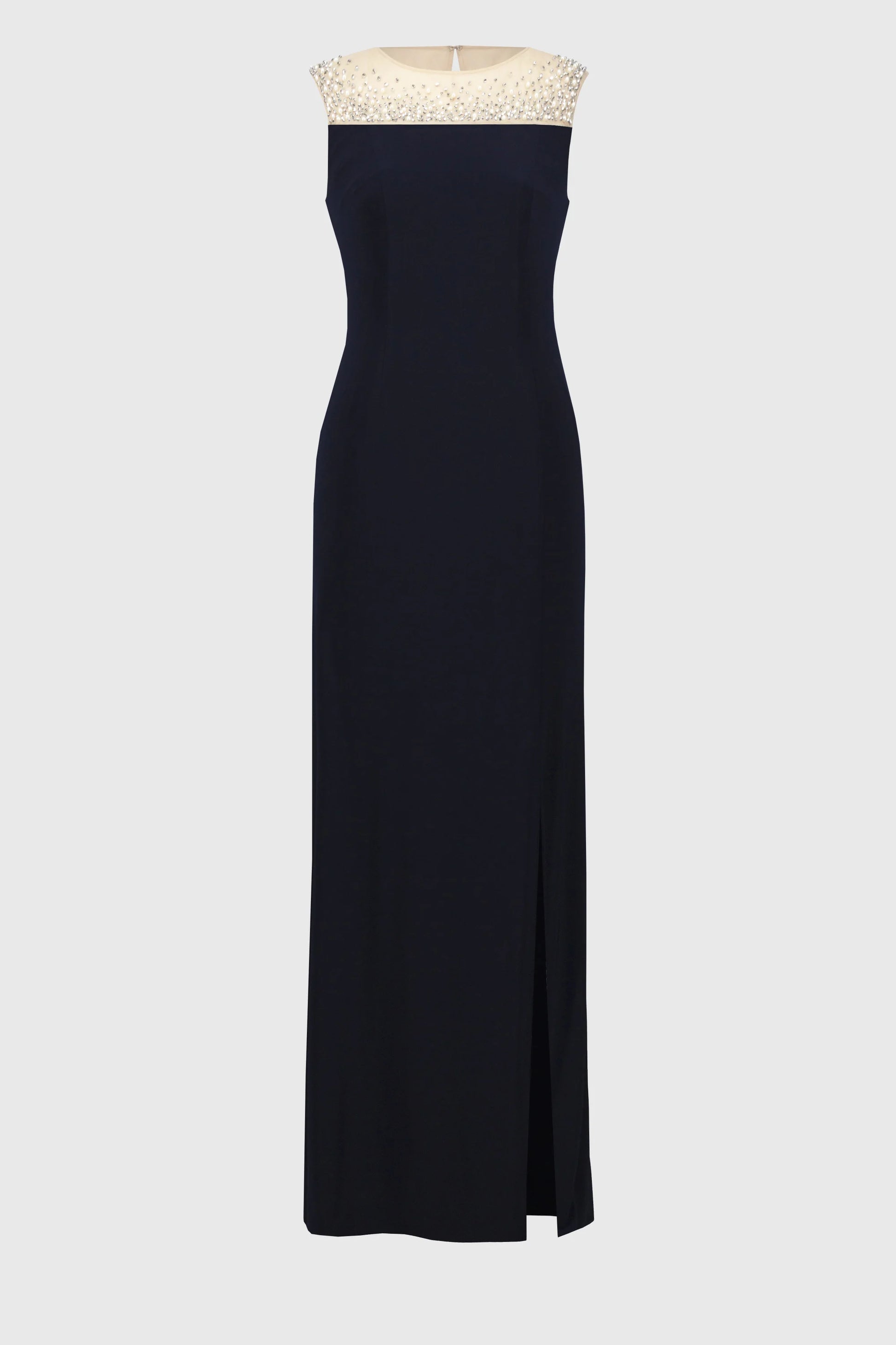 If you're searching for a drop-dead-gorgeous look for your next event, you've found it in this stunning sleeveless maxi gown. Its standout feature is the nude mesh upper adorned in pearl and silver ombre beading. You'll also appreciate its alluring front slit and back keyhole detail. Crafted from a luxe silky knit that drapes beautifully over your shape. Part of the Signature collection.