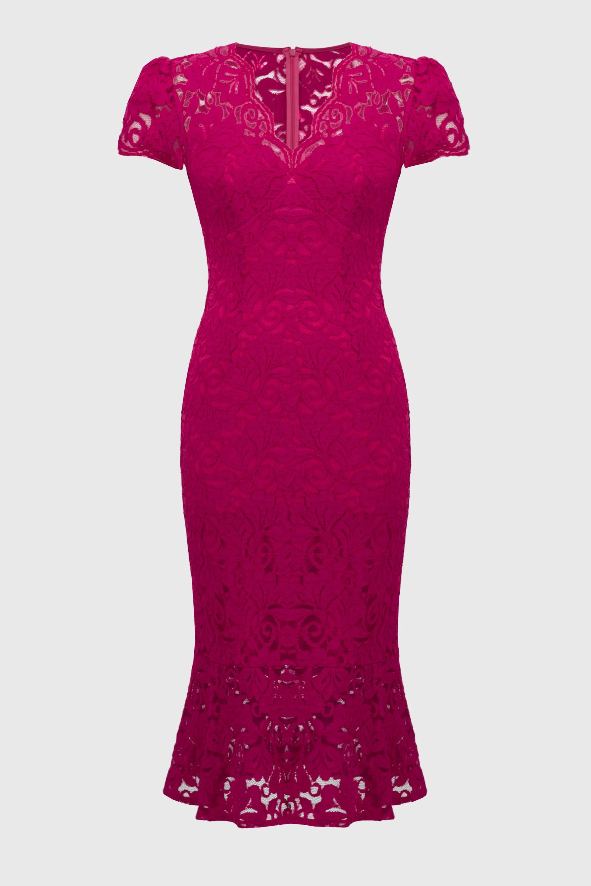 This stunning stretch lace dress will bring the romance back and leave a lasting impression. Crafted from an intricate corded lace, this piece features short gathered cap sleeves, and a flirty flounce at the bottom hem. Refined details like a back V-neck with a scalloped edge brings an element of charm, while the soft lining adds an alluring touch. Part of the Signature collection.
