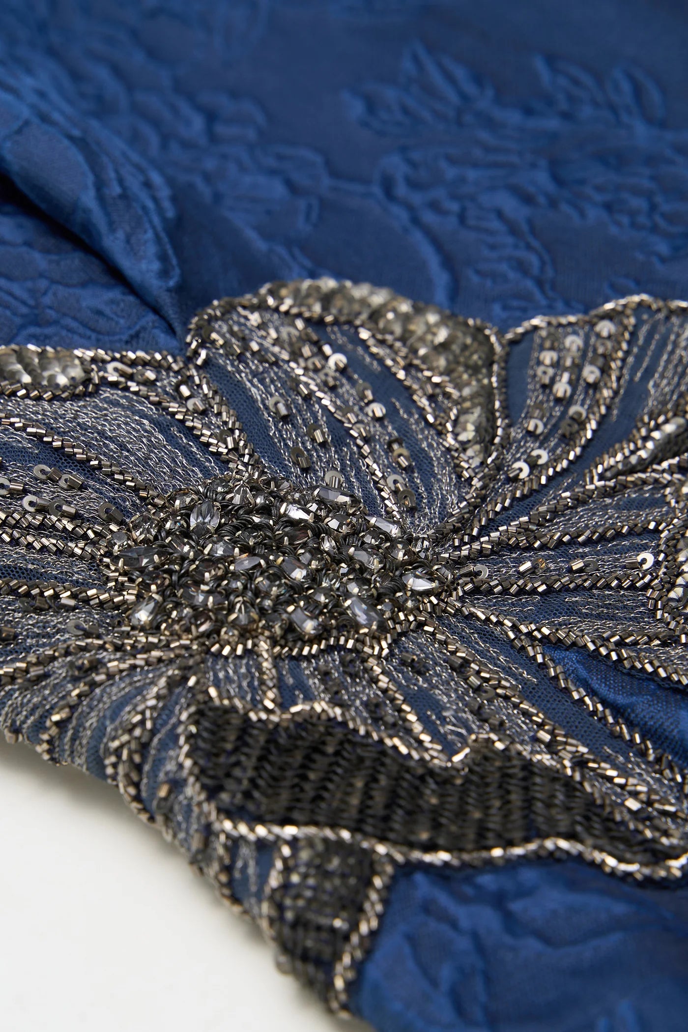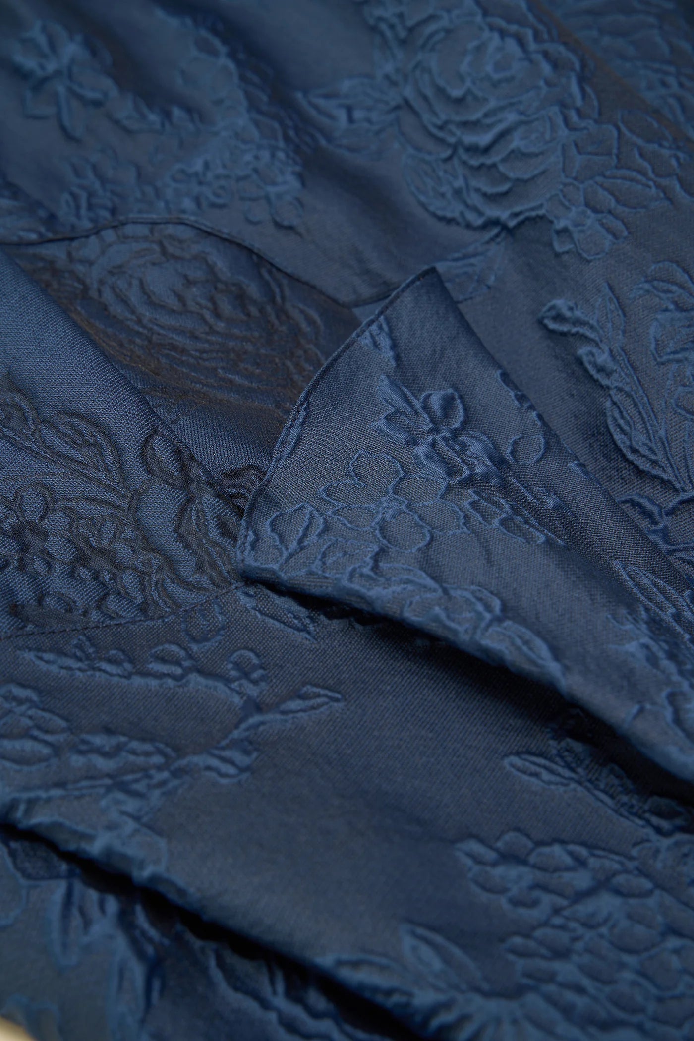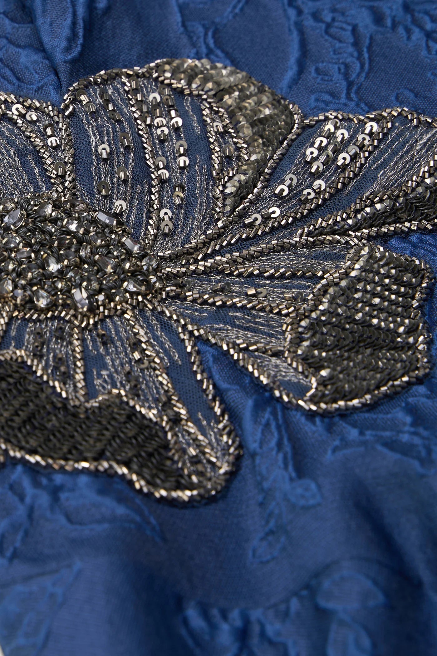 A cloud jacquard midi dress with a boat neck, high-low skirt, and shimmering beaded appliqué, blending rich texture with airy lightness.