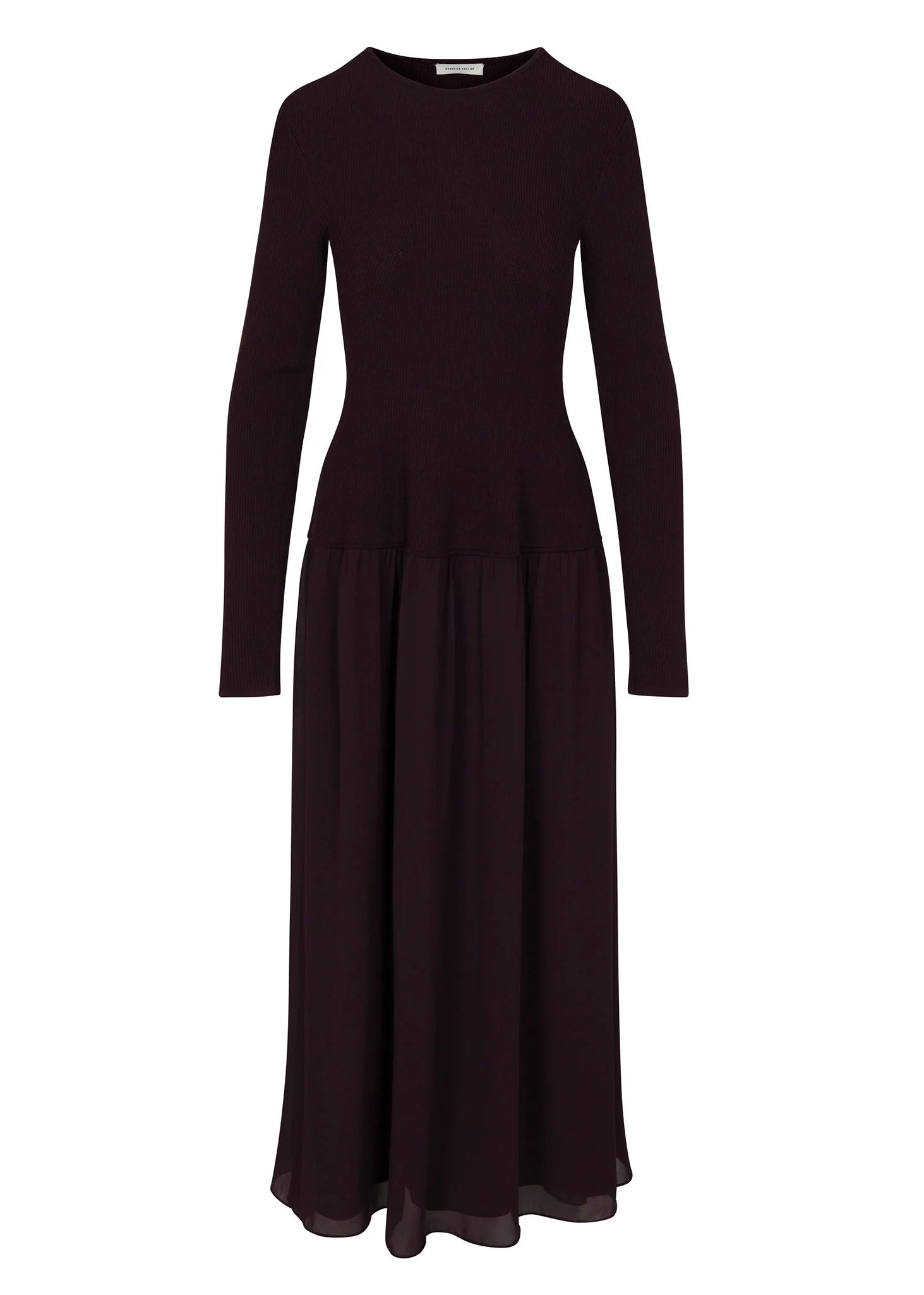 This elegant mixed media maxi dress in Raisin effortlessly blends comfort and sophistication. Featuring a fitted sweater knit bodice and a flowing chiffon woven skirt, it strikes the perfect balance of structure and fluidity, making it ideal for any occasion. With long sleeves, a classic round neckline, and dramatic maxi length, this versatile dress offers a graceful silhouette for both day and night.