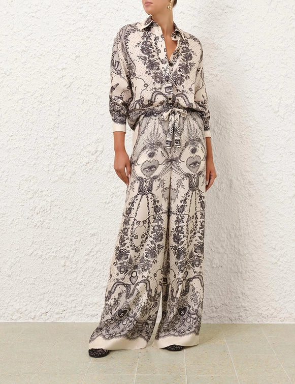 The Crush Draw Waist Pant in Ivory Locket from our Resort 2025 Collection, Crush. A silk high waisted pant featuring an elasticated waist with a drawstring.