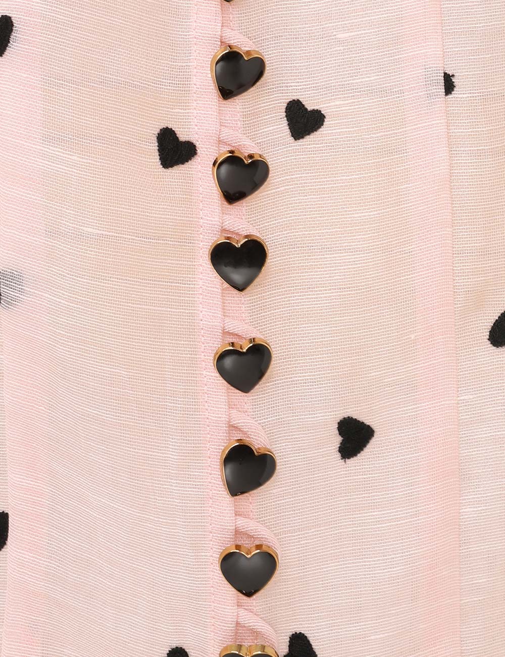 The Crush Embroidered Blouse in Pink Hearts from our Resort 2025 Collection, Crush. A silk linen blouse featuring a plunging V-neckline with embroidered frills and a neck tie; finished with rouleau loops and heart buttons down the centre front.