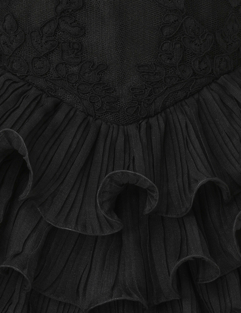 The Crush Lace Frill Midi Dress in Black from our Resort 2025 Collection, Crush. A midi dress featuring a crew neckline, gathered pleated frills around the hips and an invisible centre back zip closure.