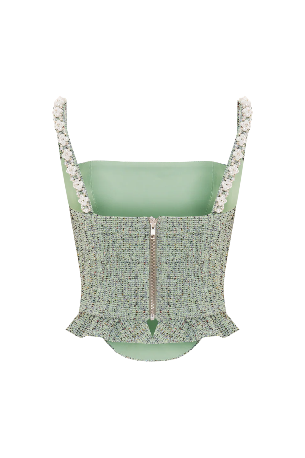 The Crystal Tweed Top blends tailored precision with modern romance. Featuring a straight neckline and pearl-embroidered straps, its structured boning creates a flattering corset-style fit. A subtle V-cut and flounced hem add a touch of elegance and charm. Finished with a back zip closure, it’s a refined yet striking piece.