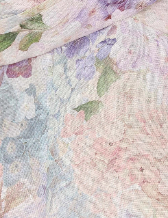 The Dawning Puff Sleeve Mini Dress in Multi Hydrangea from our Spring 2025 Collection, Illumination. A linen mini dress featuring a twisted detailing at the centre bust and ruched back with invisible zip centre back.