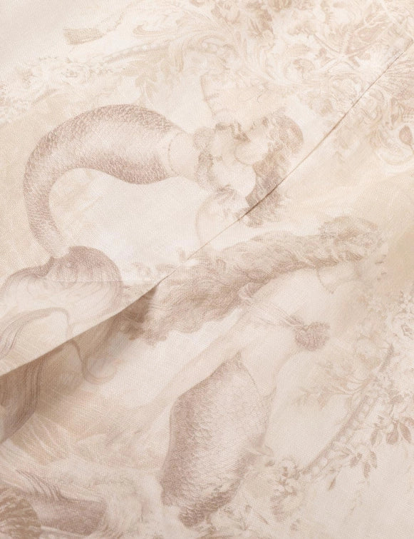 The Drape Midi Dress in Mermaid Toile from our Cruise 2026 Collection, Twisted Romance. A linen midi dress featuring a fitted bodice, shirred back and straps, keyhole detailing across bust, finished with an invisible zip closure and ruching.