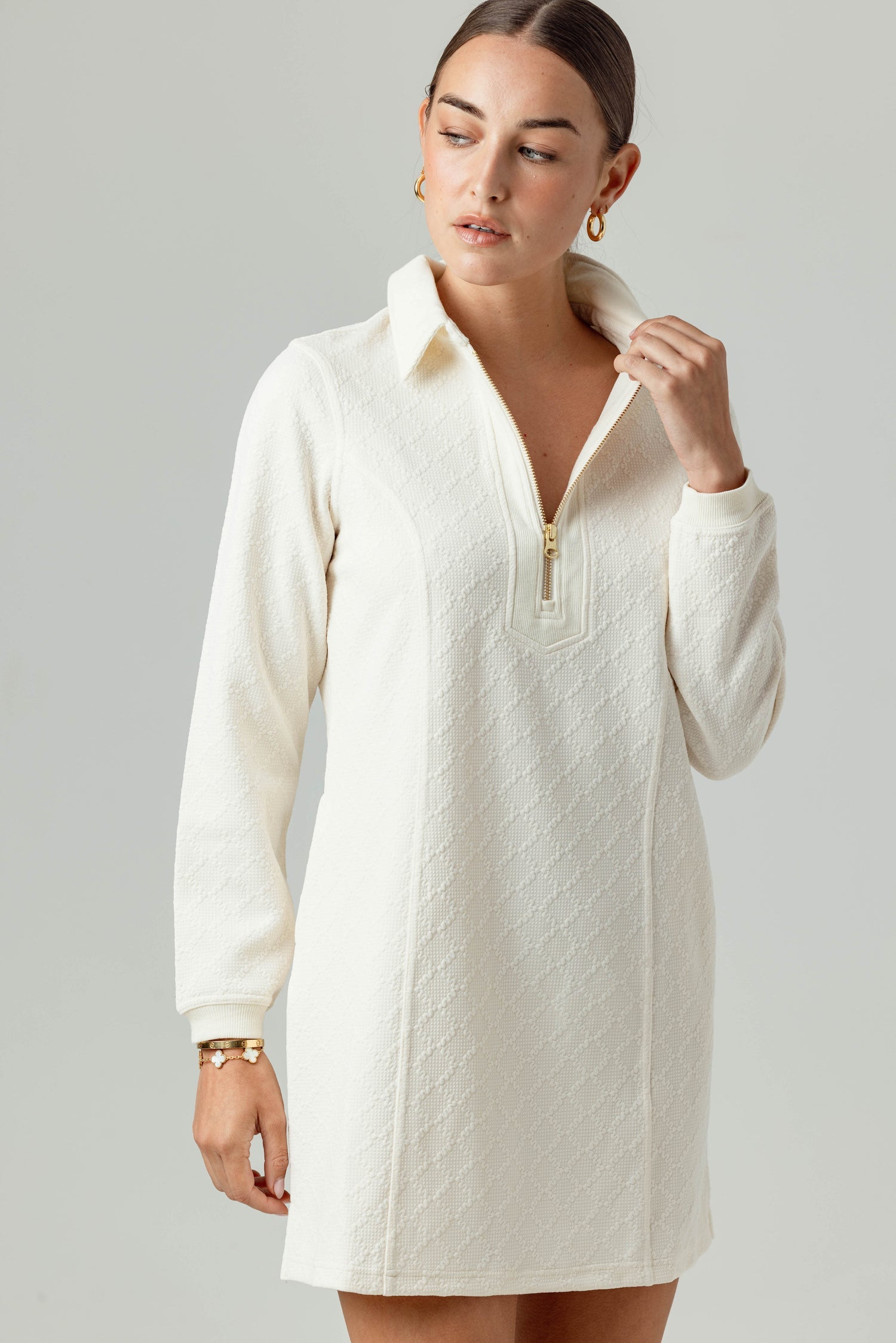 The Elliot dress is made from a new textured knit fabric. Featuring a classic collar and a quarter zip front, Elliot has a slimming fit through the body thanks to the princess seams feature. The perfect length, this casual-chic dress will finish just past your fingertips. And, yes, it has pockets.