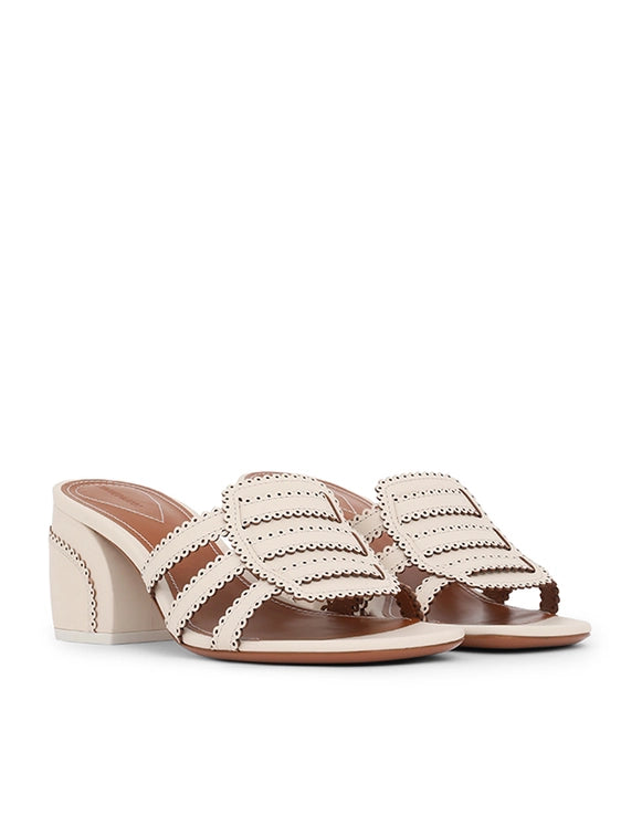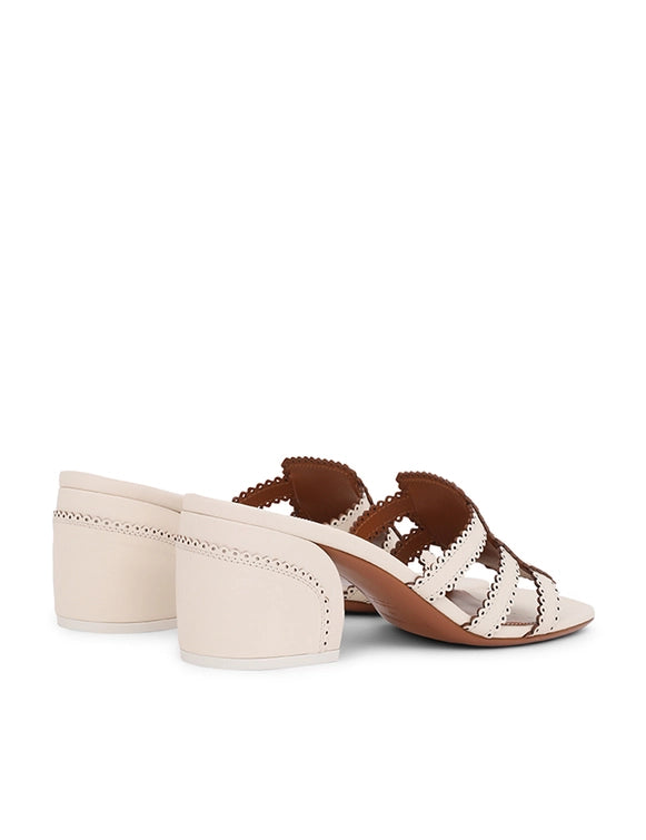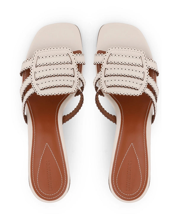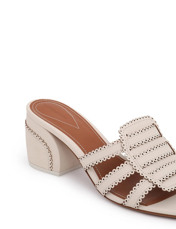 The Goldie Slide 65 in Macadamia from our Summer Swim 2025 Collection. A leather mule heel featuring a 65mm block heel and scalloped edges.