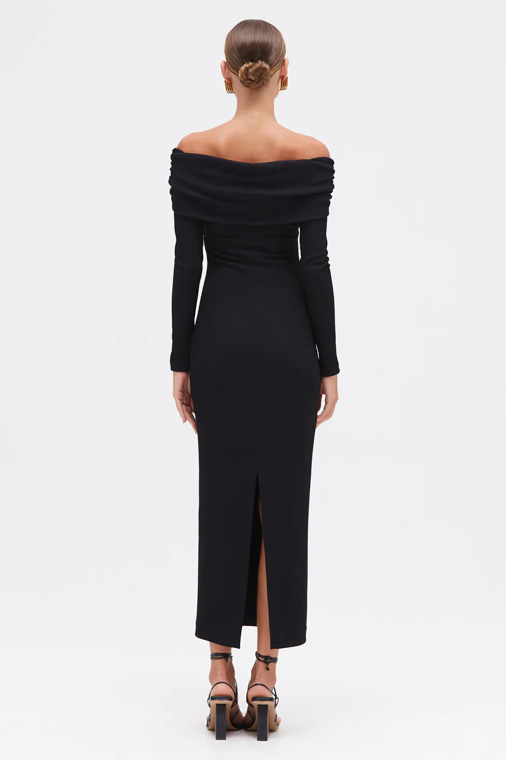 The Grace Knit Draped Midi Dress is a sleek, off-the-shoulder silhouette crafted in a soft black knit that hugs the body in all the right places. Featuring long sleeves and a gold-tone buckle detail at the bust, it combines understated elegance with a bold focal point.