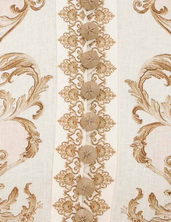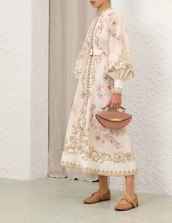 The Hypnotic Buttoned Midi Dress in Cream Peony from our Fall 2025 Collection, Hypnotic. A linen midi dress featuring long blouson sleeves with zippered cuffs, raffia buttons down the centre front and a removable self covered belt.