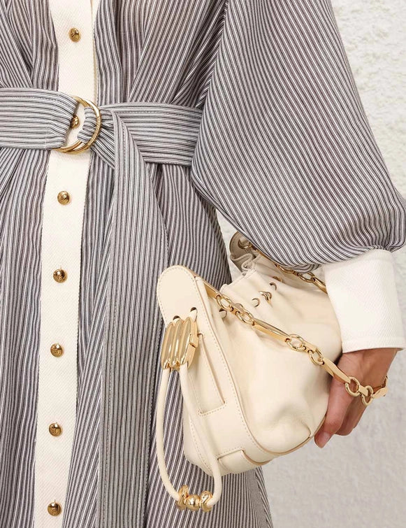 The Hypnotic Tuck Midi Dress in Navy Stripe from our Fall 2025 Collection, Hypnotic. A cotton blend midi dress featuring tucks at the waistline and sleeve hem with a self covered removable belt.