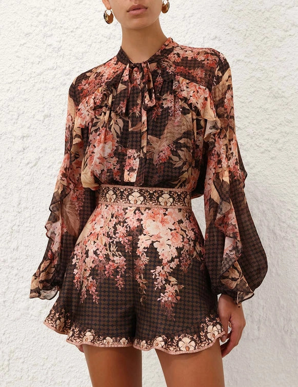 The Illuminate Flutter Blouse in Black Floral from our Spring 2025 Collection, Illumination. A placement print blouse featuring a V-neckline with a self tie neck tie, long blouson sleeves with elasticated cuffs, and frill detailing at the shoulders, neckline, and down the sleeves.