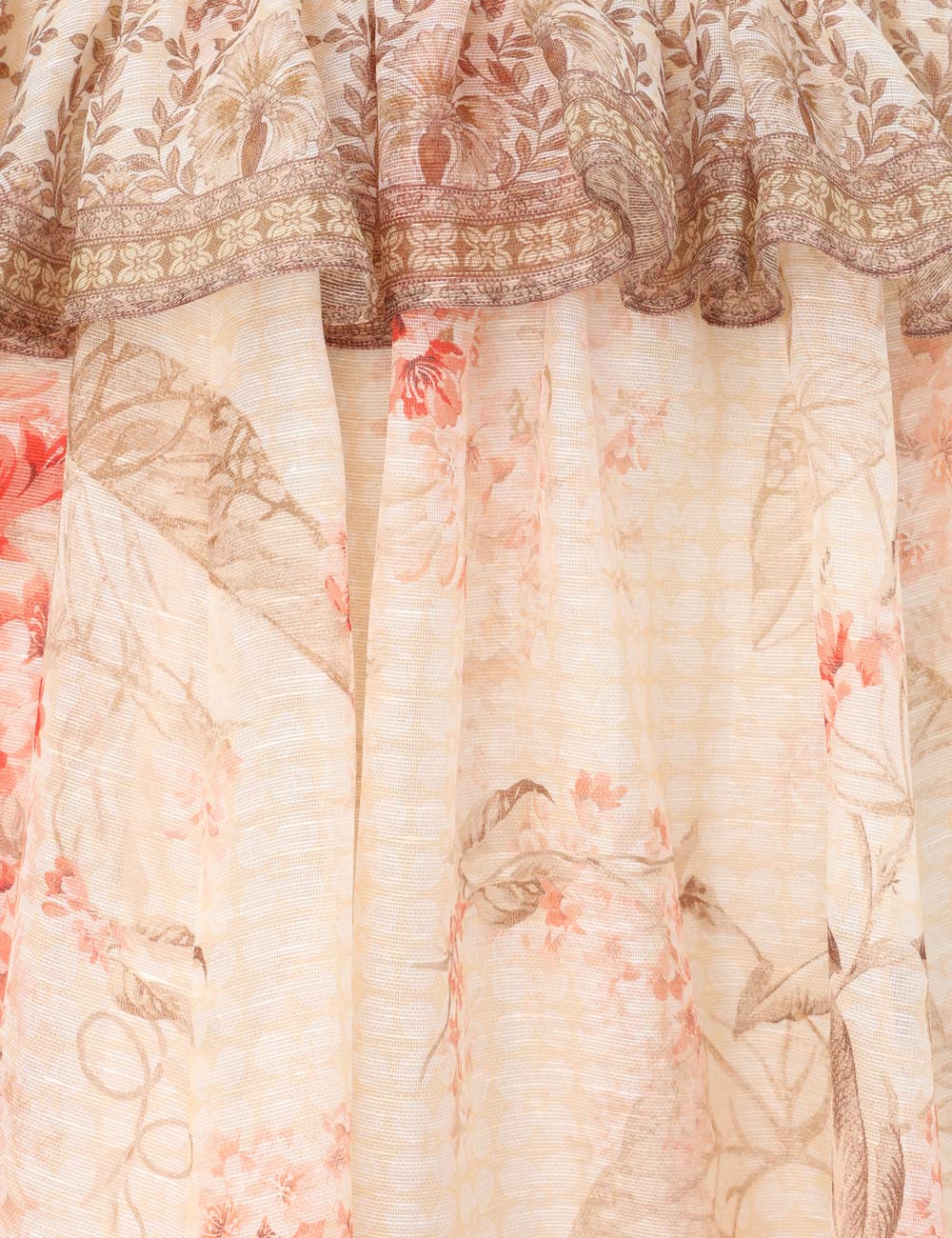 The Illuminate Halter Midi Dress in Coral Floral from our Spring 2025 Collection, Illumination. A silk linen midi dress featuring a frilled stand collar, ruffle detailing at the waist with adjustable ties at the sides, finished with a center back zip closure and side seam pockets.