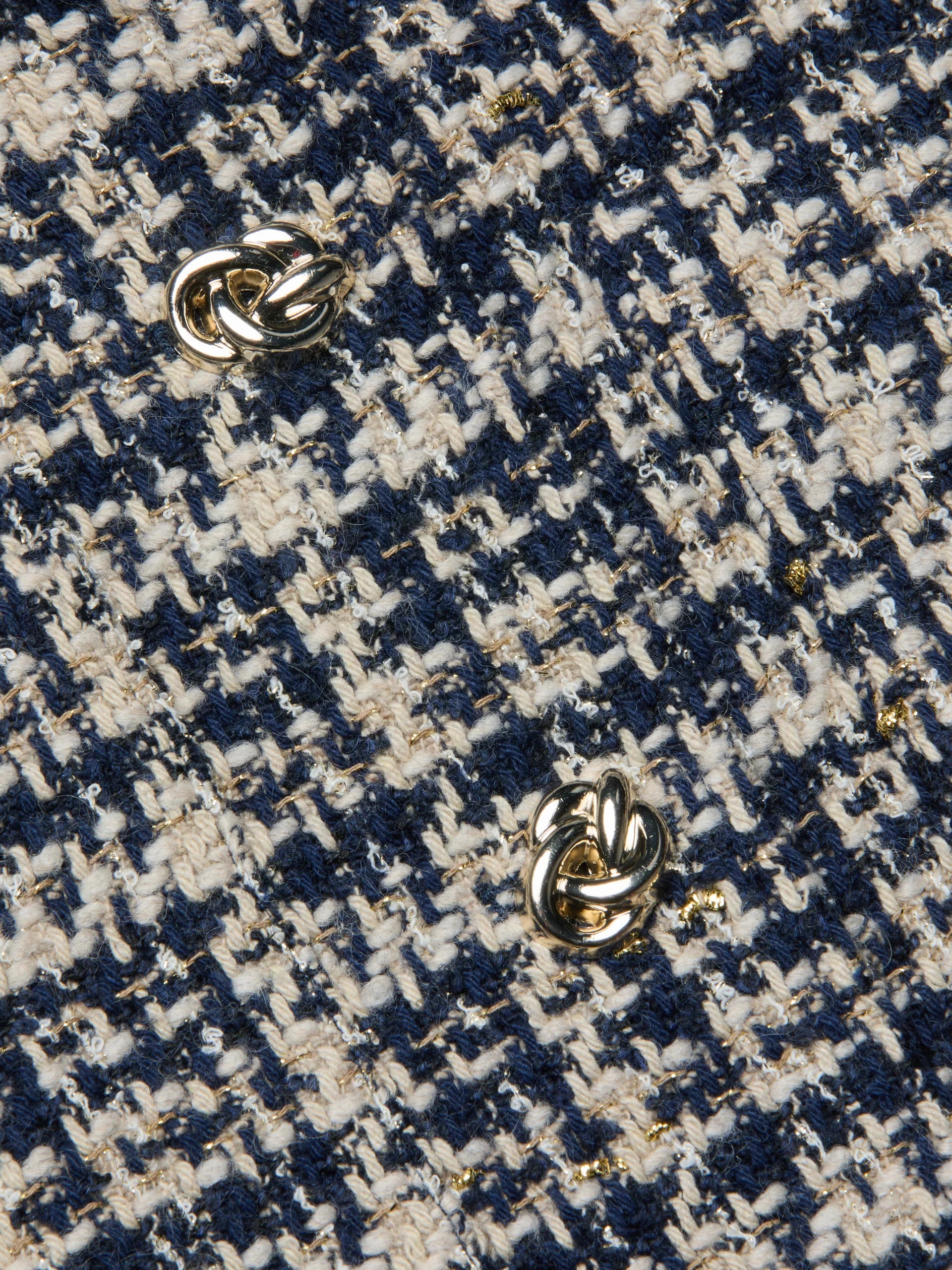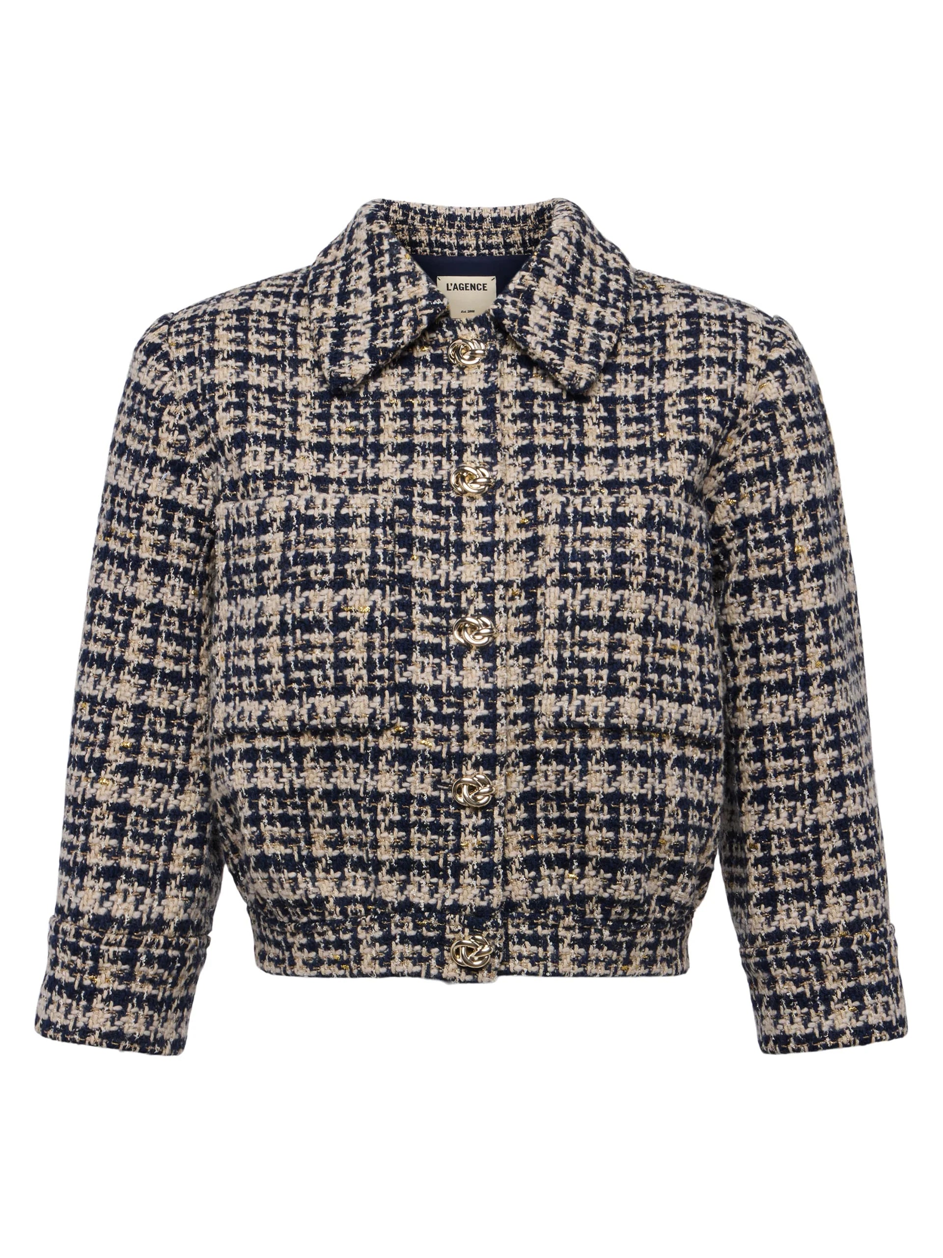 A ladylike, three-quarter sleeve jacket crafted from a navy, cream, and gold textured tweed and finished in a chic, cropped length. Wear the Jia as a top or second layer.