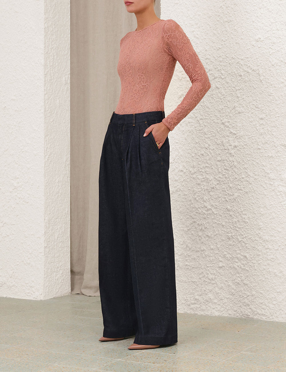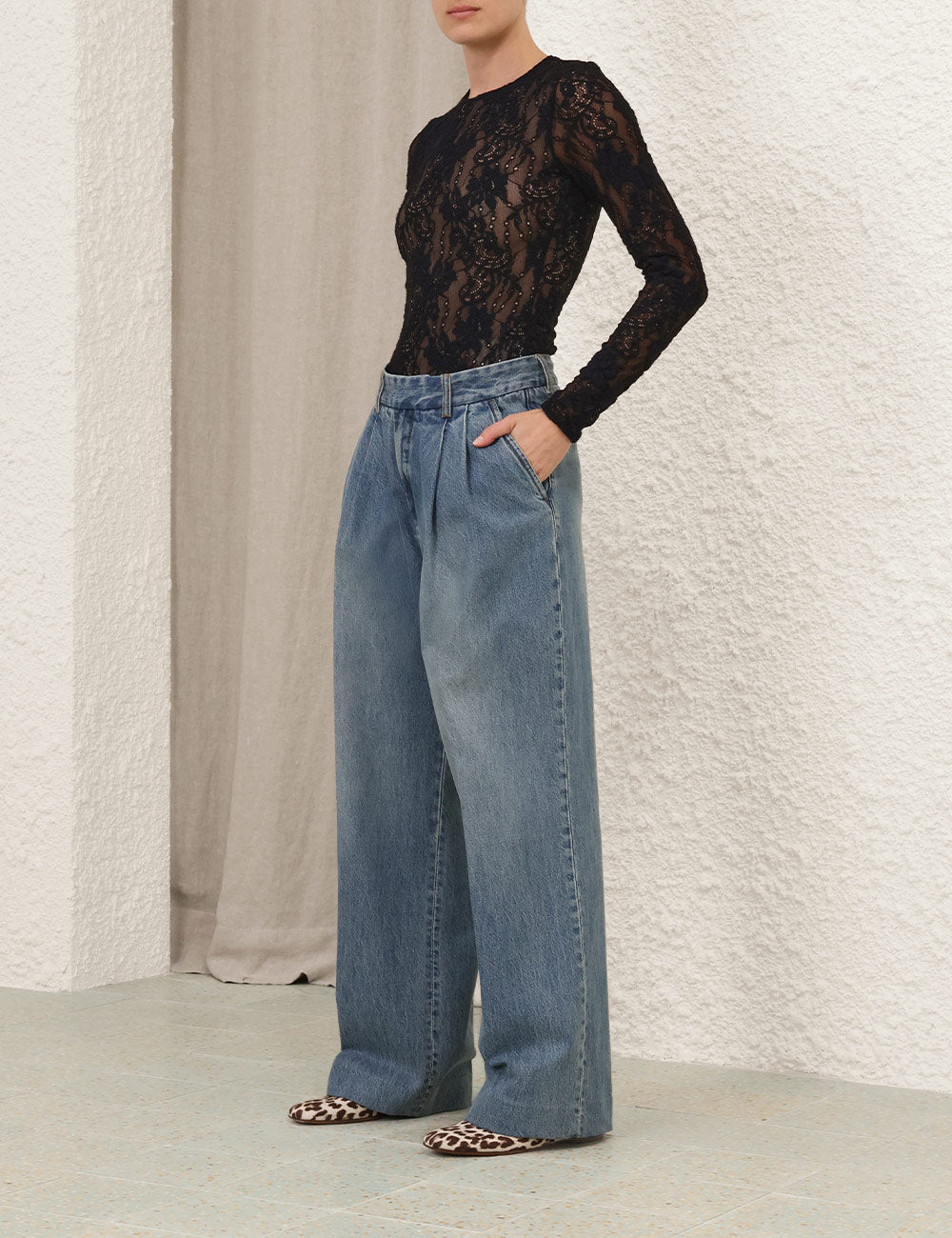 The Lace Bodysuit in Light Blue from our Resort 2025 Collection, Crush. A lace bodysuit featuring a crew neckline and long sleeves.
