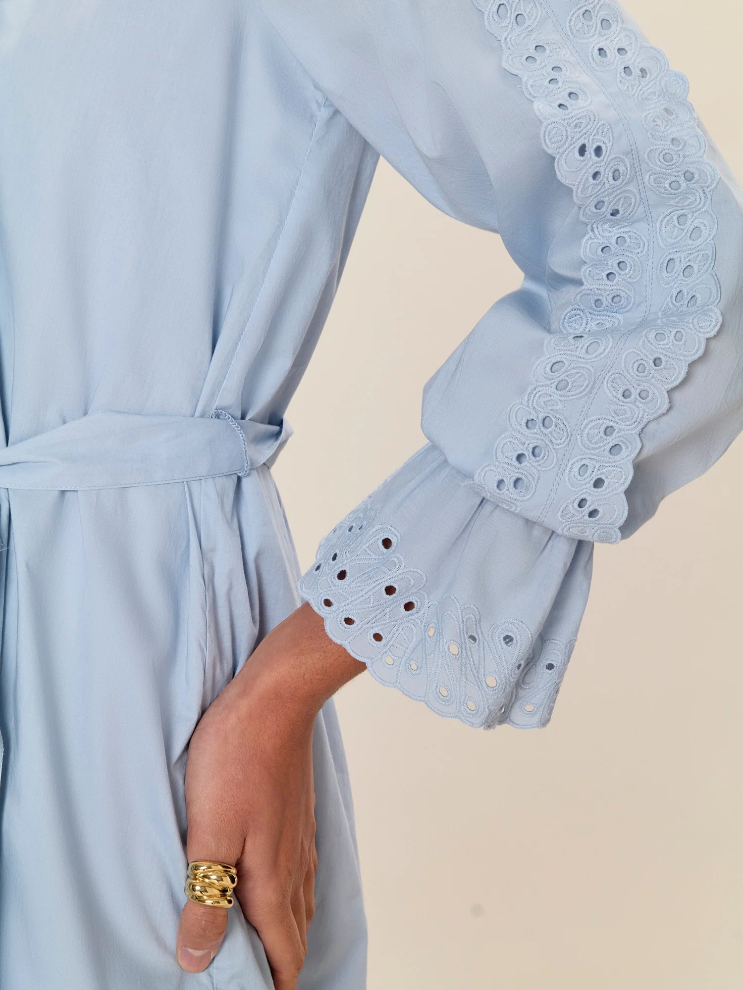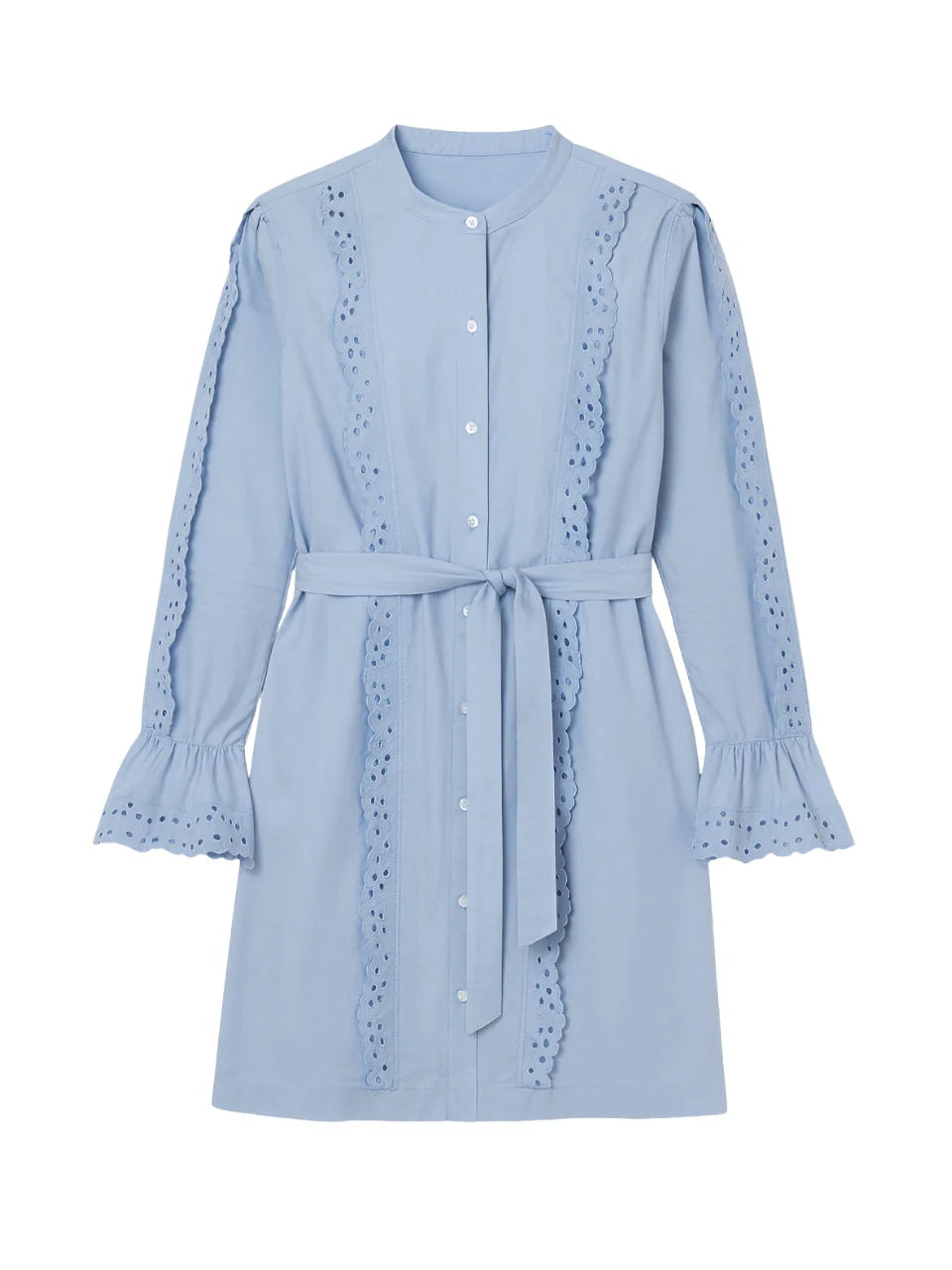 Crafted from soft, breathable cotton, the Lorelai Tunic Dress blends everyday ease with artisanal detail. This button-front silhouette features intricate embroidered eyelet trim framed along the placket and sleeves, while a removable self-tie belt allows for personalized shaping at the waist. Gently flared sleeves with elasticated cuffs add a feminine finish, creating a polished yet effortless piece suitable for both casual days and refined occasions.