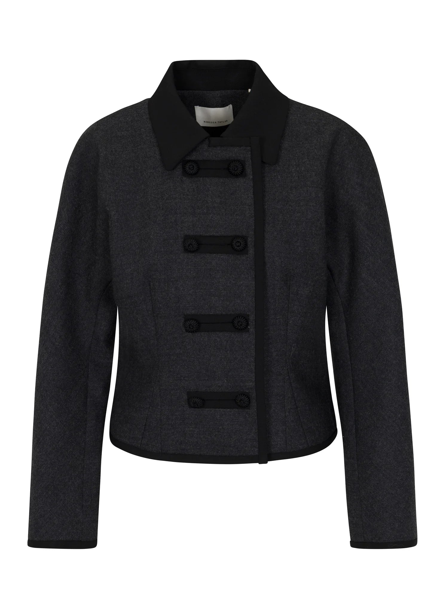 This sophisticated Femme Military Jacket in charcoal exudes refined elegance with a touch of authority. It's adorned with distinctive soutache buttons for a polished finish.