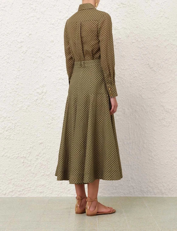 The Luna Cargo Shirt in Olive Dot from our Spring 2026 Collection, Kindred Spirit. A ramie shirt featuring a classic collar, centre front buttons, patch pockets, finished with fitted cuffs and an asymmetric hem.