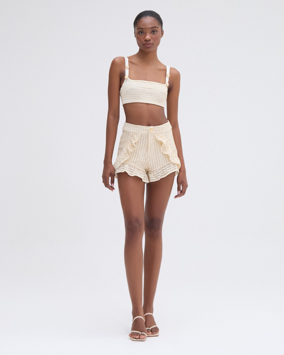 This knit bikini top features a square neckline and bandeau-type fit with button detail along the medium-thick straps. Back clasp closure.