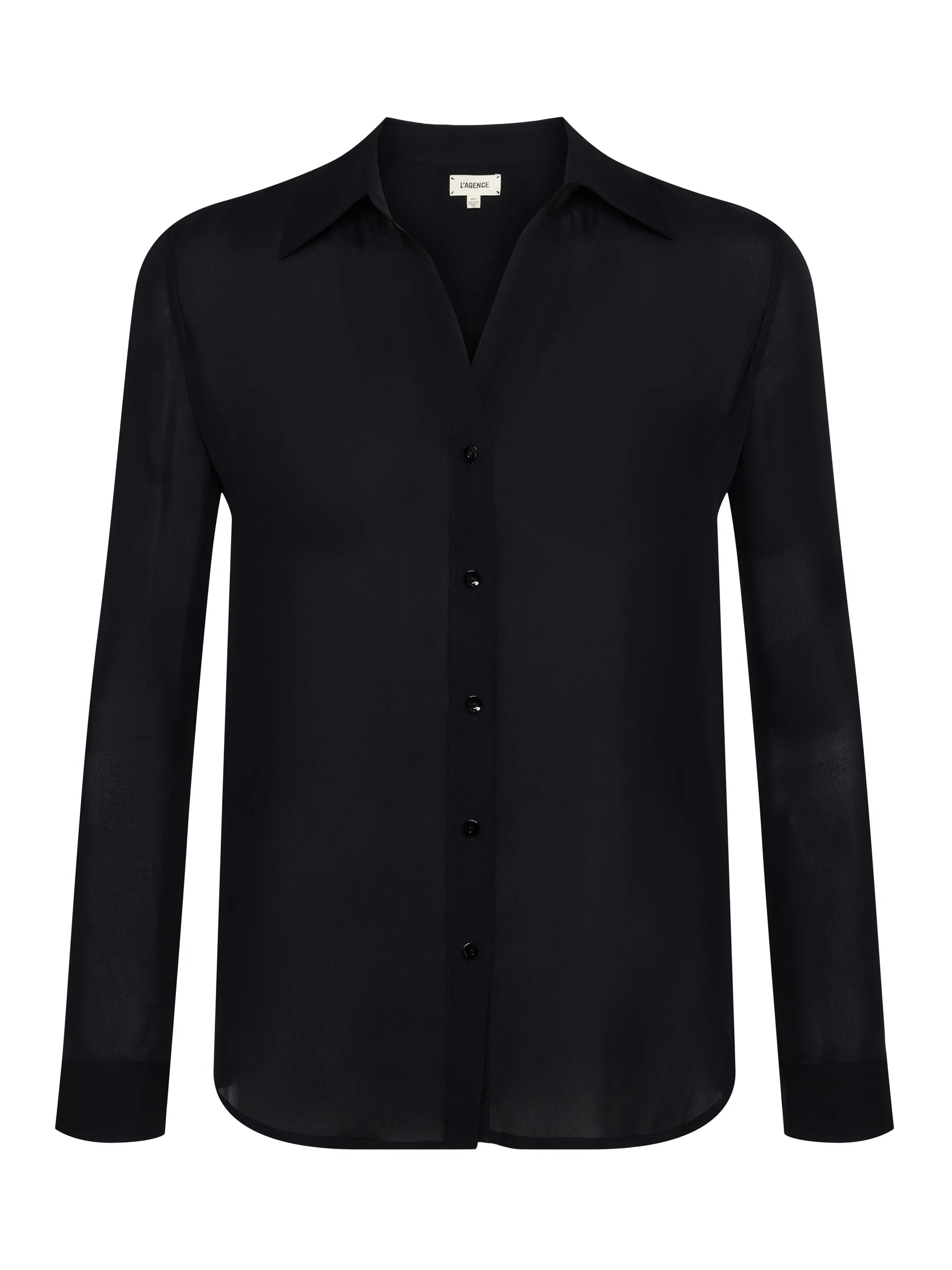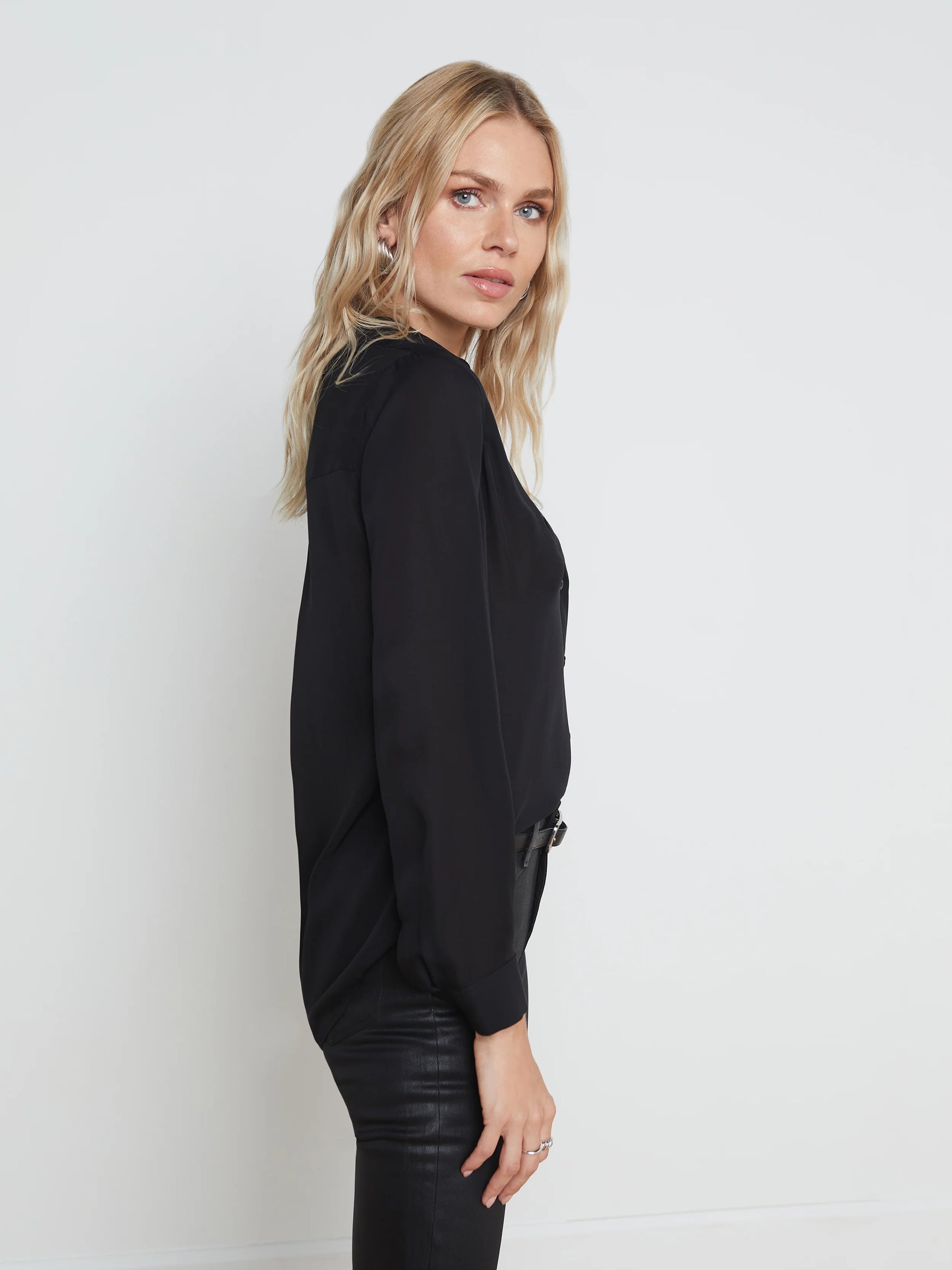A modern classic. The Nina blouse is structured in all the right places with a relaxed, flattering fit. Refined button-down construction with a chic open collar and draped long sleeve in black silk.