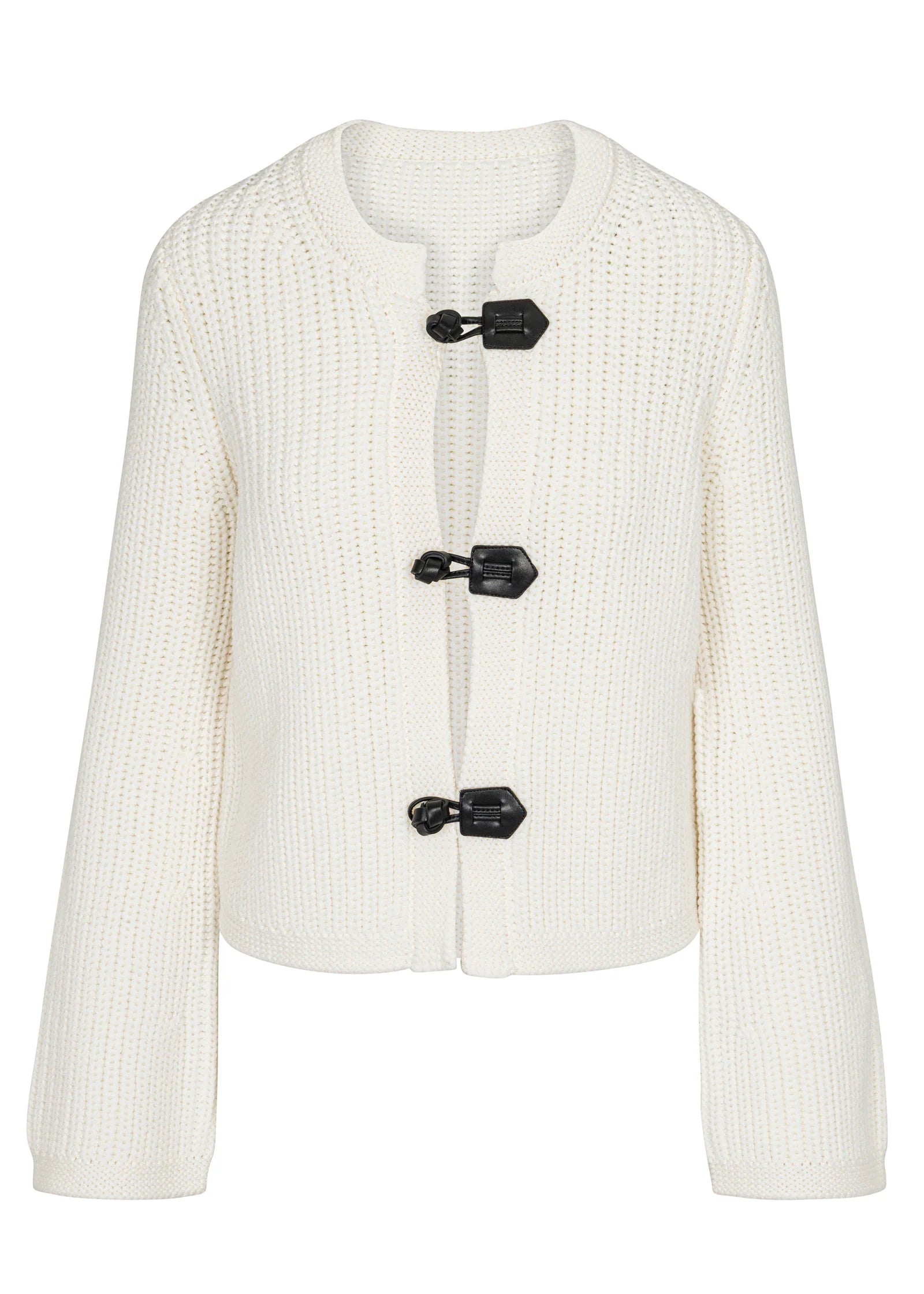 Featuring a leather toggle closure and a cozy, textured knit, this cardigan combines practicality with chic design. Perfect for adding warmth and style to any outfit, it's a versatile piece for your wardrobe.