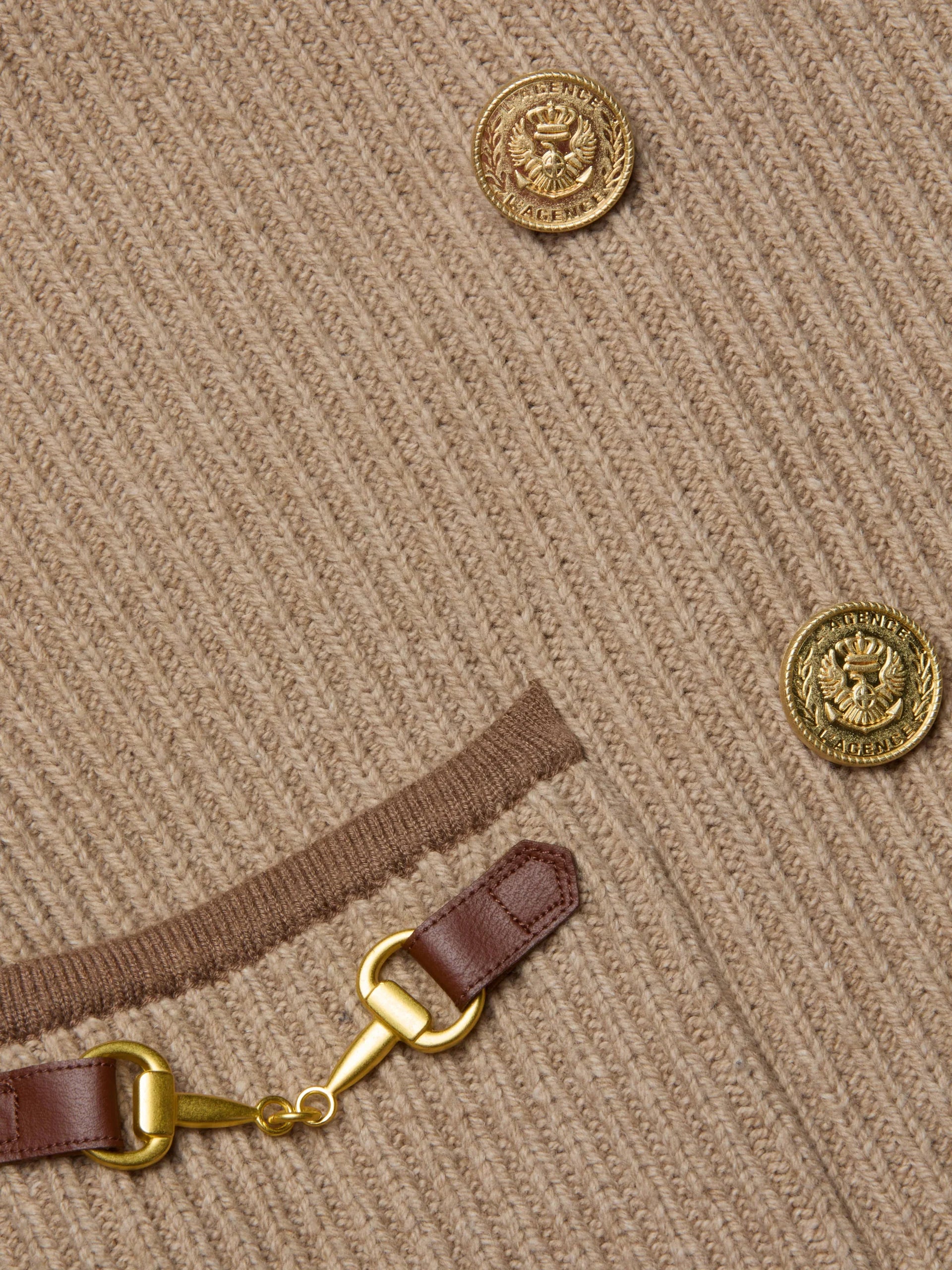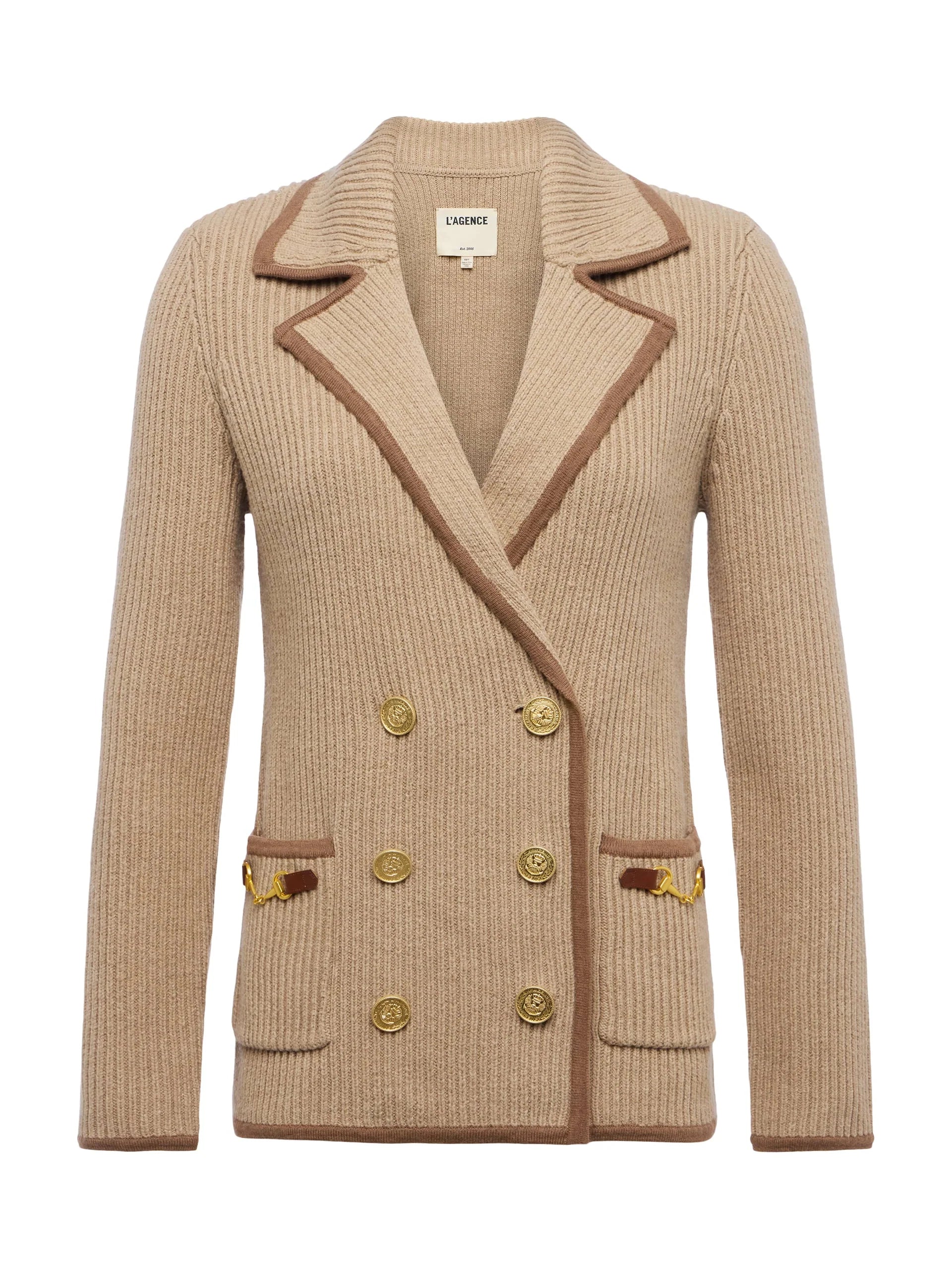 The Ranch brings laid-back elegance to the classic blazer silhouette. Crafted in structured ribbed knit, it features a double-breasted front, notched lapels, and contrast trim. Coin buttons and horse bit accents add refined distinction, making it a standout piece for desk to drinks.