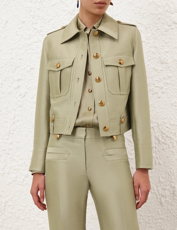 The Rebellion Crop Utility Jacket in Palm from our Cruise 2026 Collection, Twisted Romance. A wool blend cropped jacket featuring a classic collar, gold button detailing and front flap pockets.