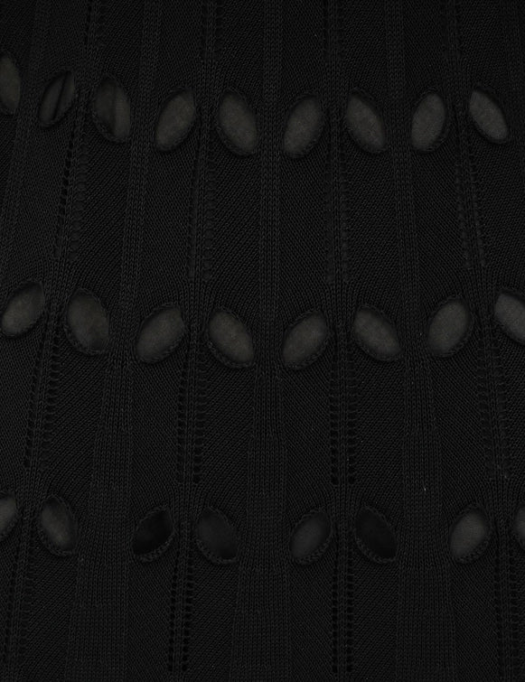 The Rhiannon Pointelle Maxi Dress in Black from our Summer Swim 2025 Collection. A knit maxi dress with a deep V-neckline, long fitted sleeves and flared hem.