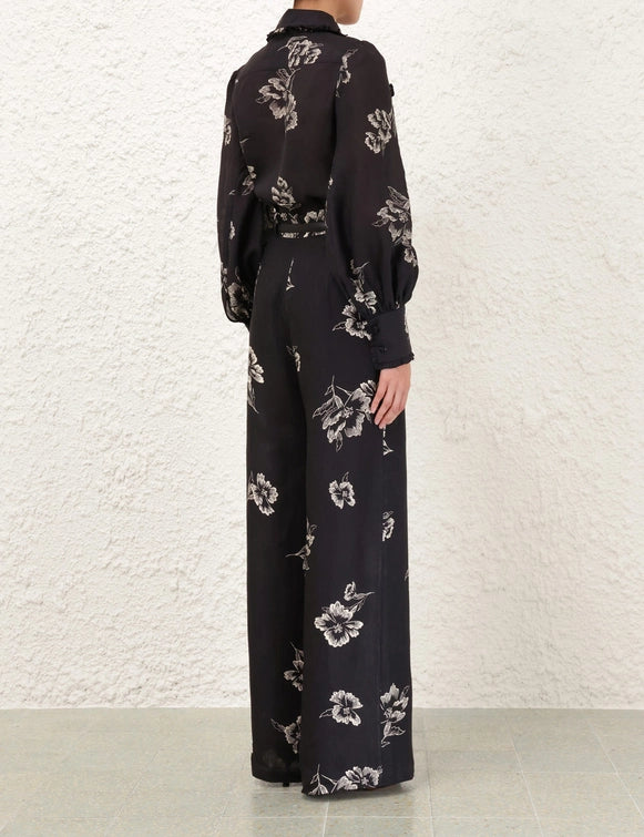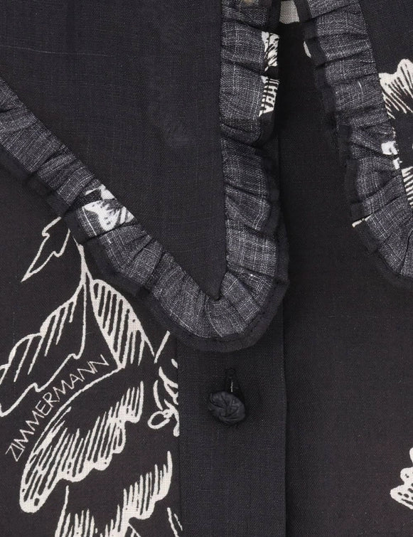 The Ruffle Bow Shirt in Black Poppy from our Spring 2025 Collection, Illumination. A ramie long sleeve blouse featuring gathered detailing through sleeves, buttons down the centre front, finished with a self tie neck tie.