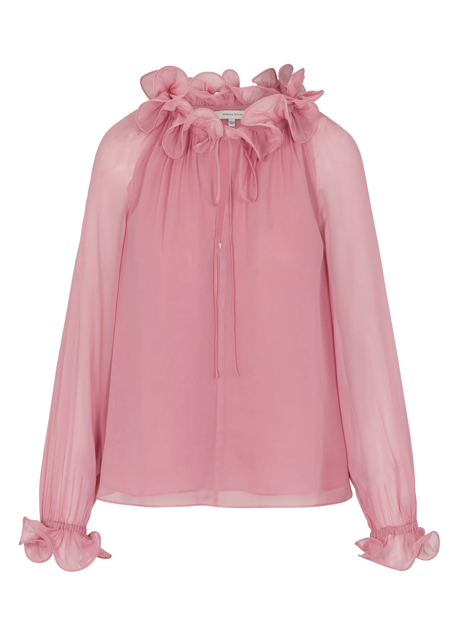 This enchanting top in a soft foxglove hue elevates a classic silhouette with romantic details. Crafted from flowing 100% viscose, it showcases a striking circular ruffle neckline, perfectly sculpted with hidden fish wire for an effortlessly elegant look.