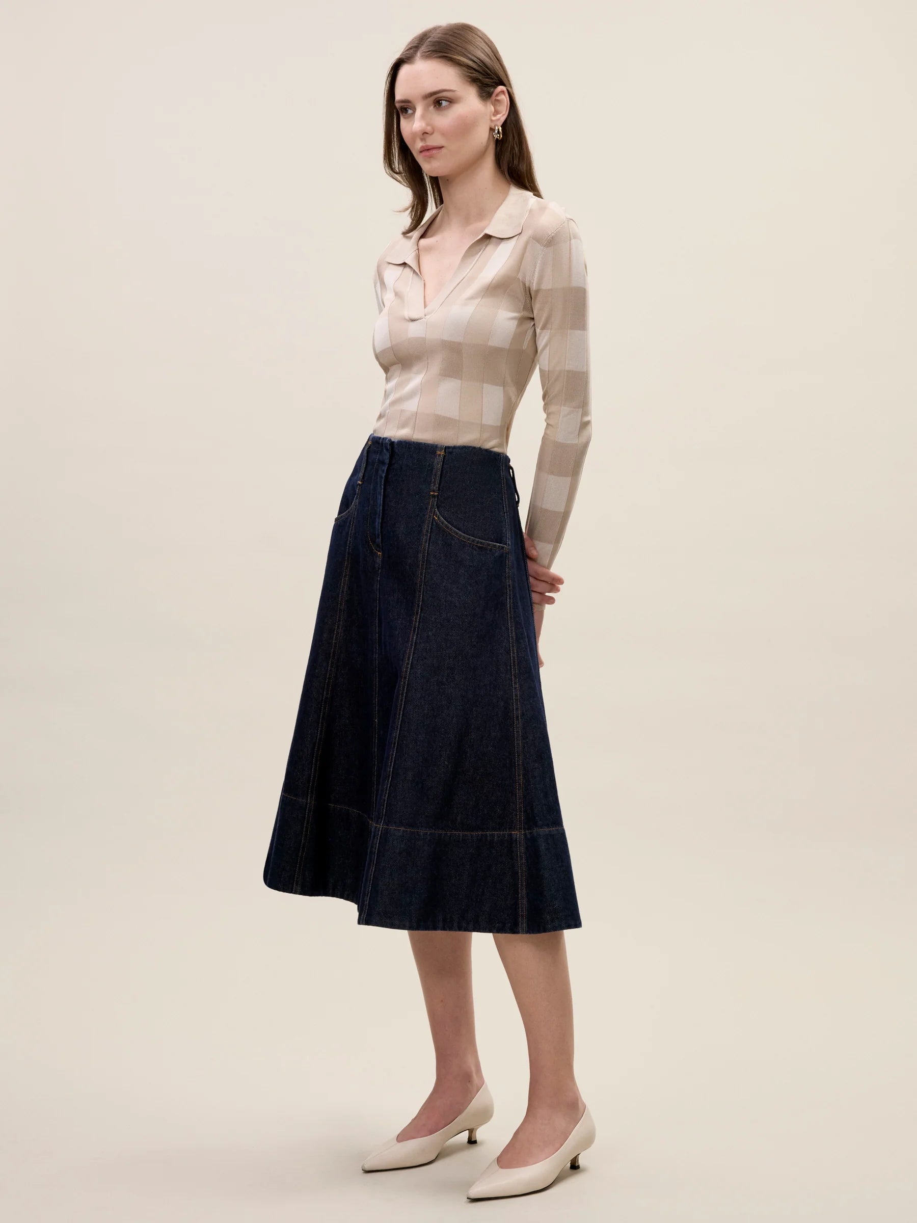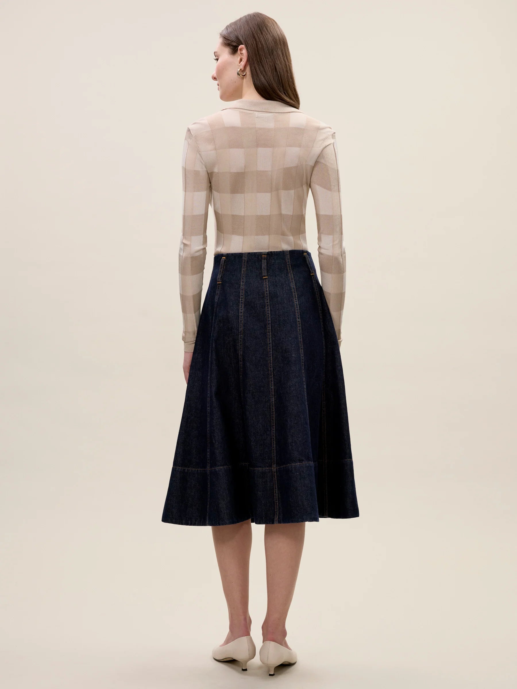 This sweater reimagines classic gingham in a soft sand palette, featuring an airy knit construction and refined polo styling. The long-sleeve design creates an effortless sophistication through its delicate pattern and lightweight feel, perfect for layering with a subtle play of transparency.