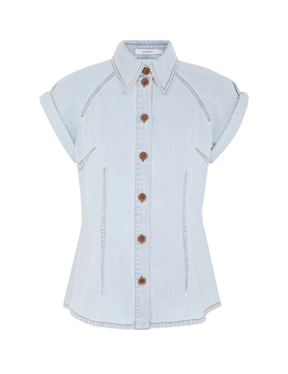 The Tallow Denim Blouse in Seaside from our Resort Swim 2025 Collection. A cotton denim shirt featuring buttons down the centre front and rolled sleeves with a classic collar.