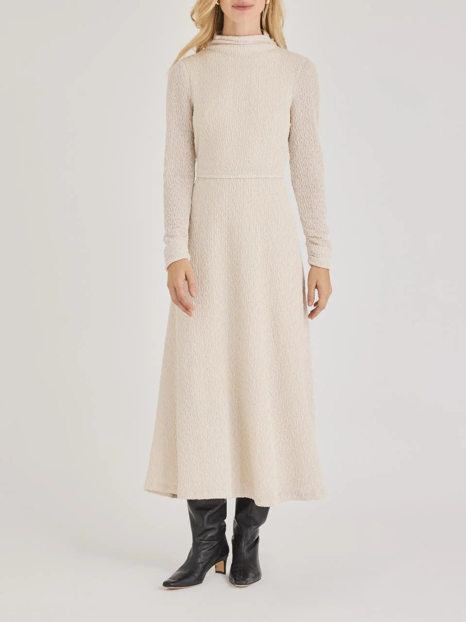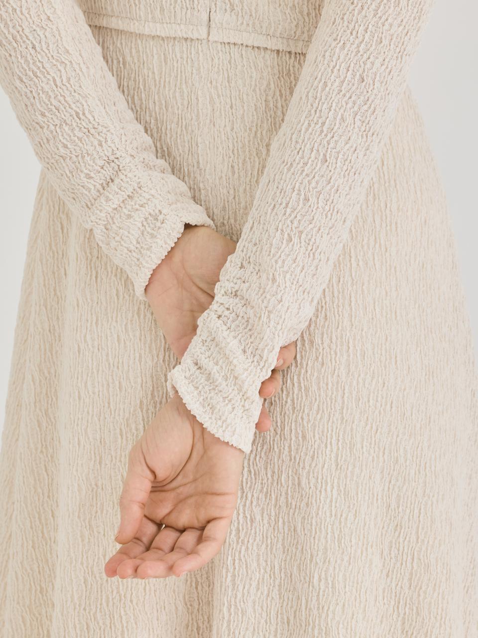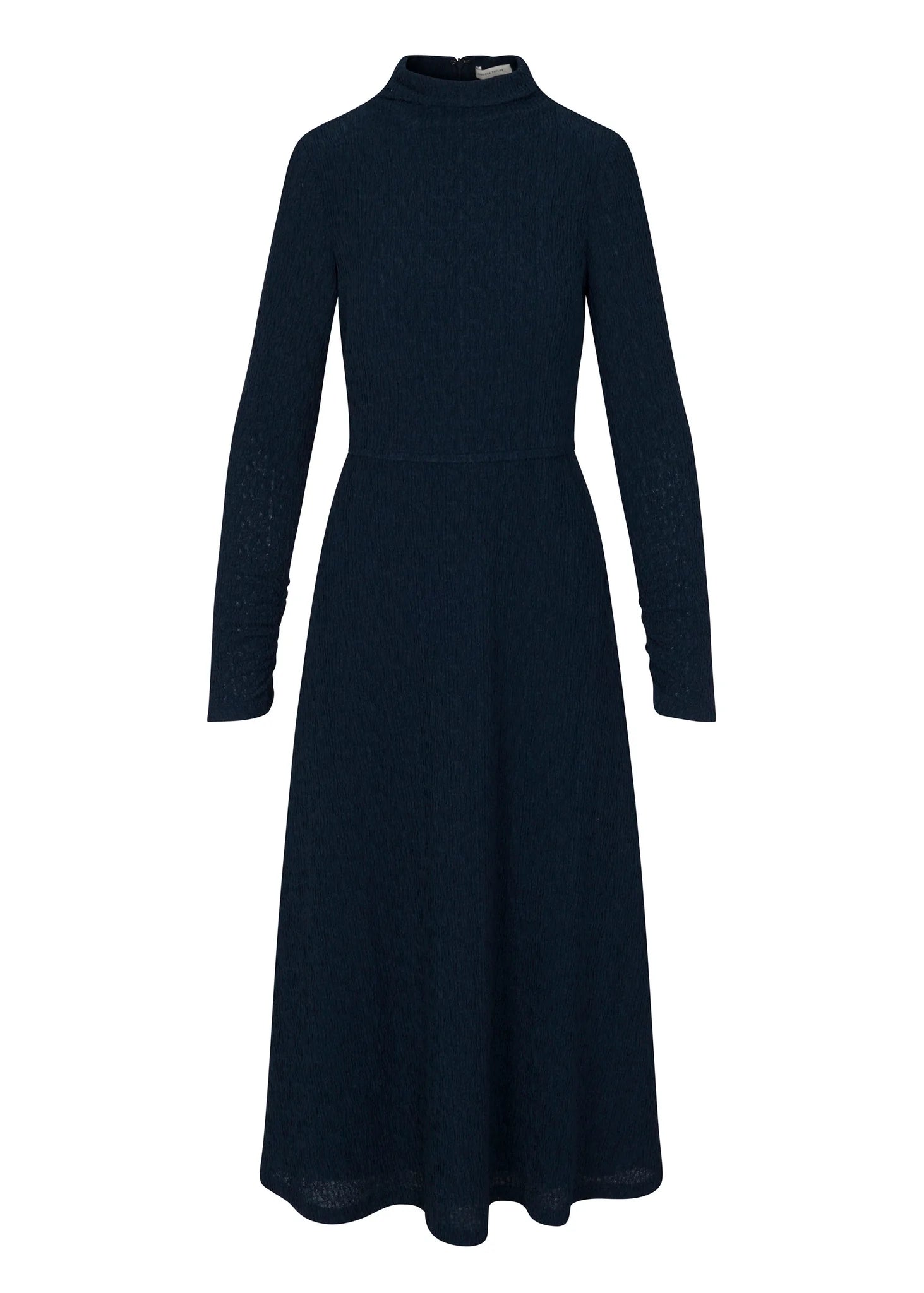 This sophisticated knit lace dress in navy seamlessly blends elegance with sustainability. Featuring a body-skimming silhouette crafted from Japanese stretch knit fabric, it offers a timeless appeal with its intricate lace pattern and midi length.