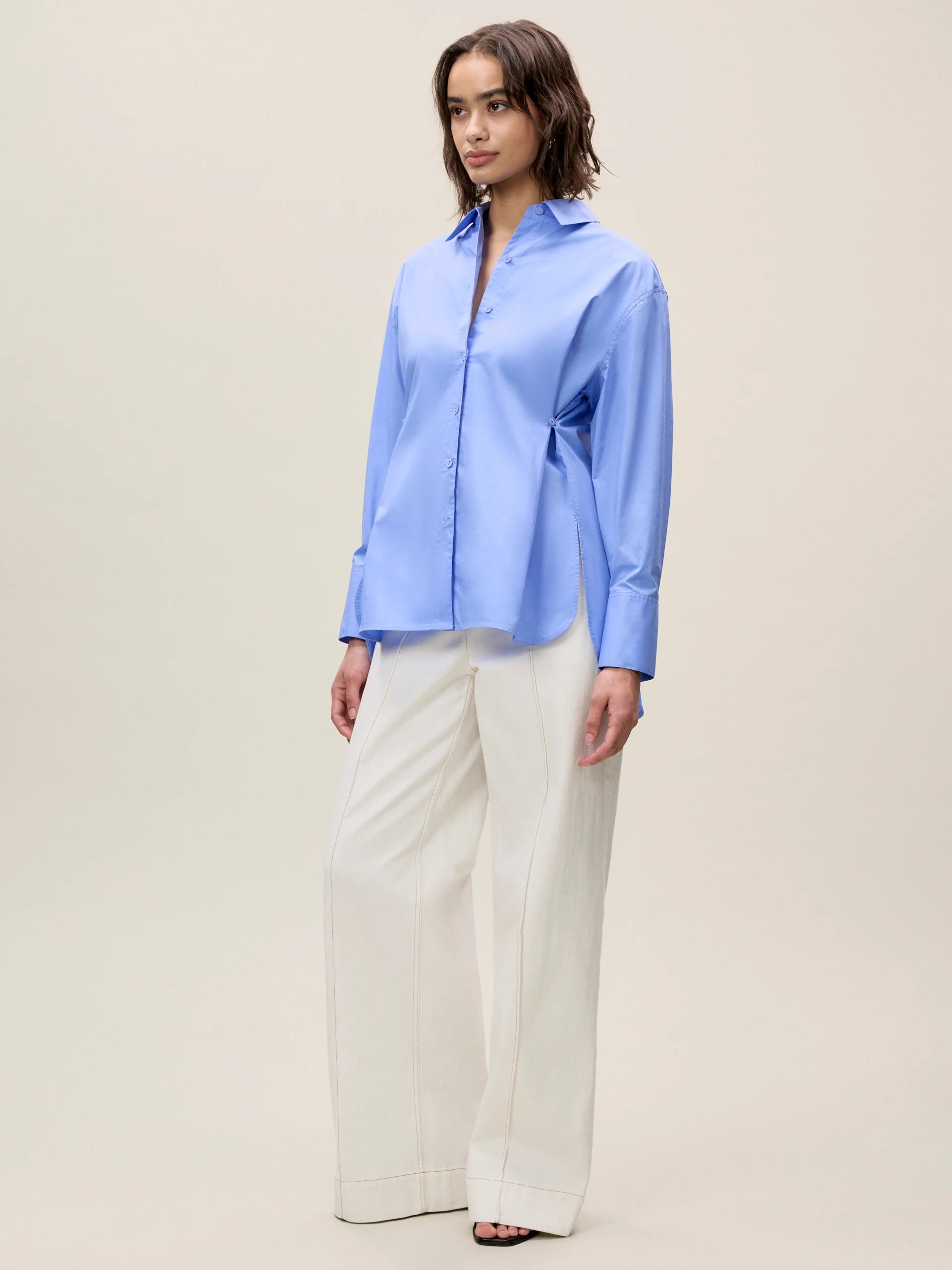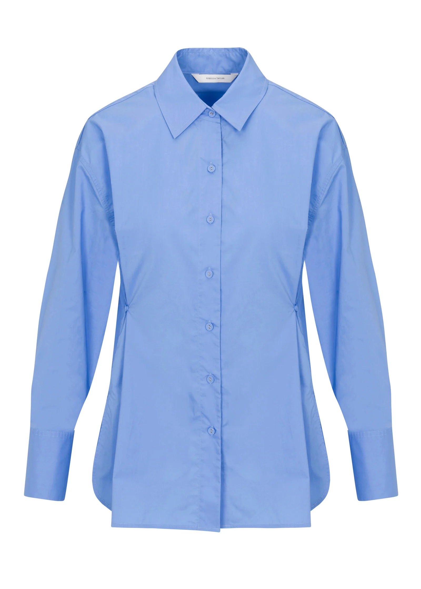 This poplin shirt brings versatile charm in a refreshing bluebell hue, offering two distinct styling options in one refined piece. The innovative design transforms from a classic boxy button-down to a cinched-waist silhouette, featuring covered buttons that add subtle sophistication. Crafted from pure cotton, it combines timeless appeal with modern versatility.